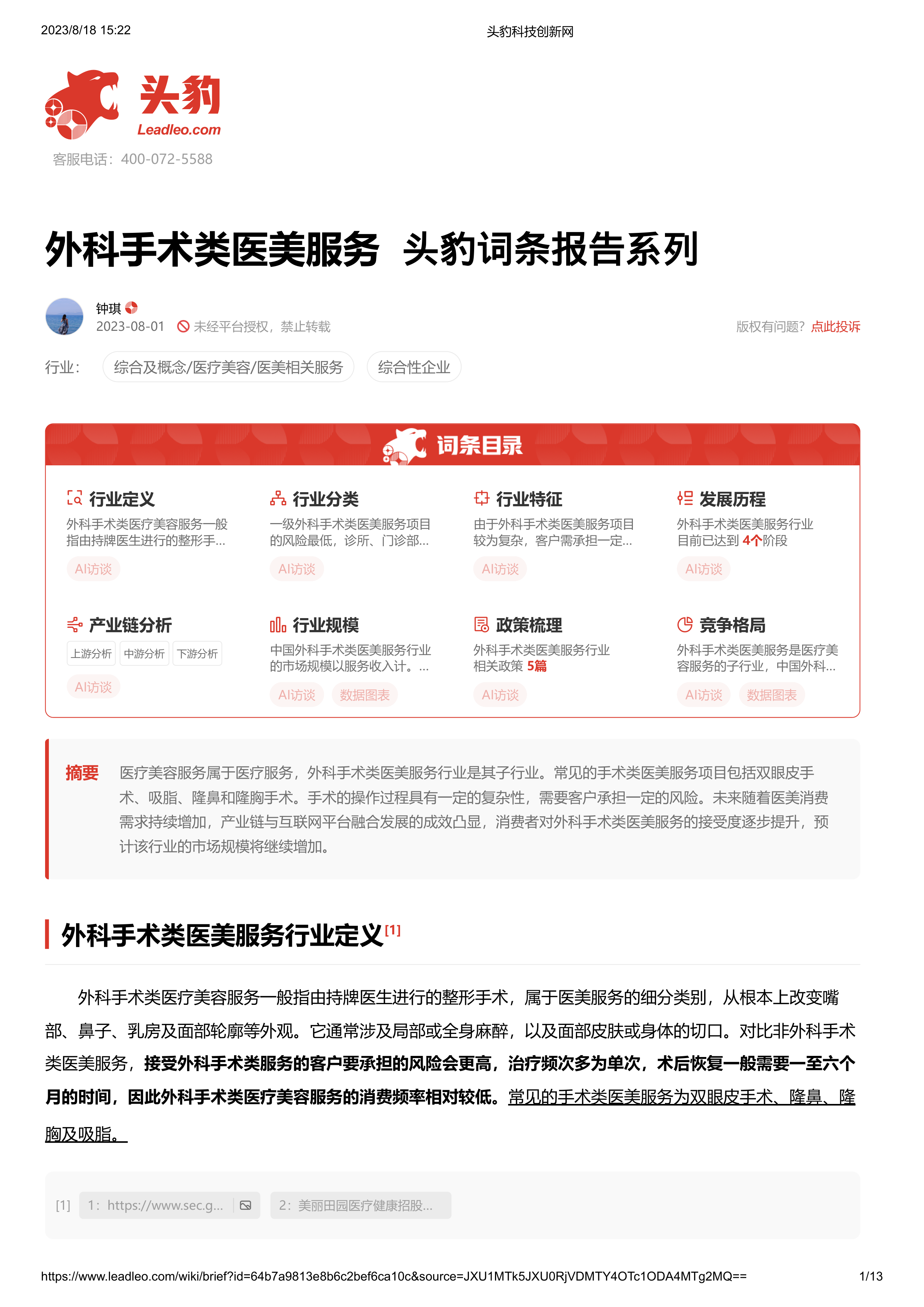 本报告基于头豹科技创新网提供的《外科手术类医美服务》词条报告,对中国外科手术类医美服务市场进行数据分析和市场解读。报告核心观点如下: