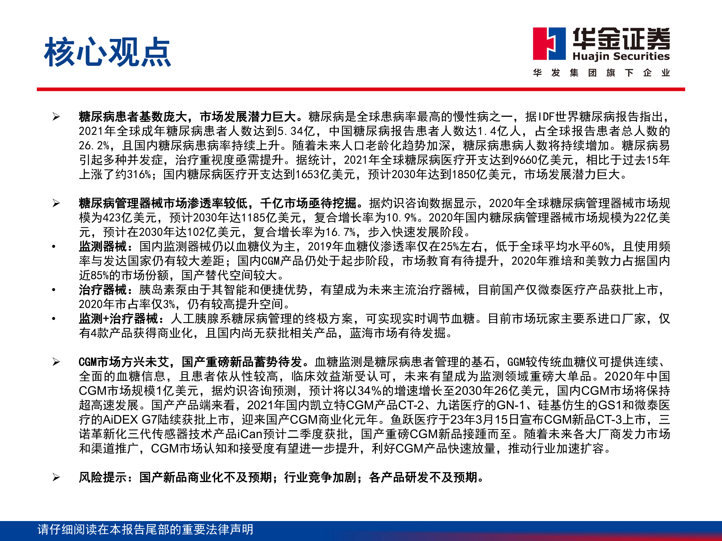 本报告的核心观点是:糖尿病患者基数庞大,市场发展潜力巨大;糖尿病管理器械市场渗透率较低,千亿市场亟待挖掘;CGM市场方兴未艾,国产重磅新品蓄势待发,国产替代空间巨大;但同时需关注国产新品商业化不及预期、行业竞争加剧以及产品研发不及预期的风险。