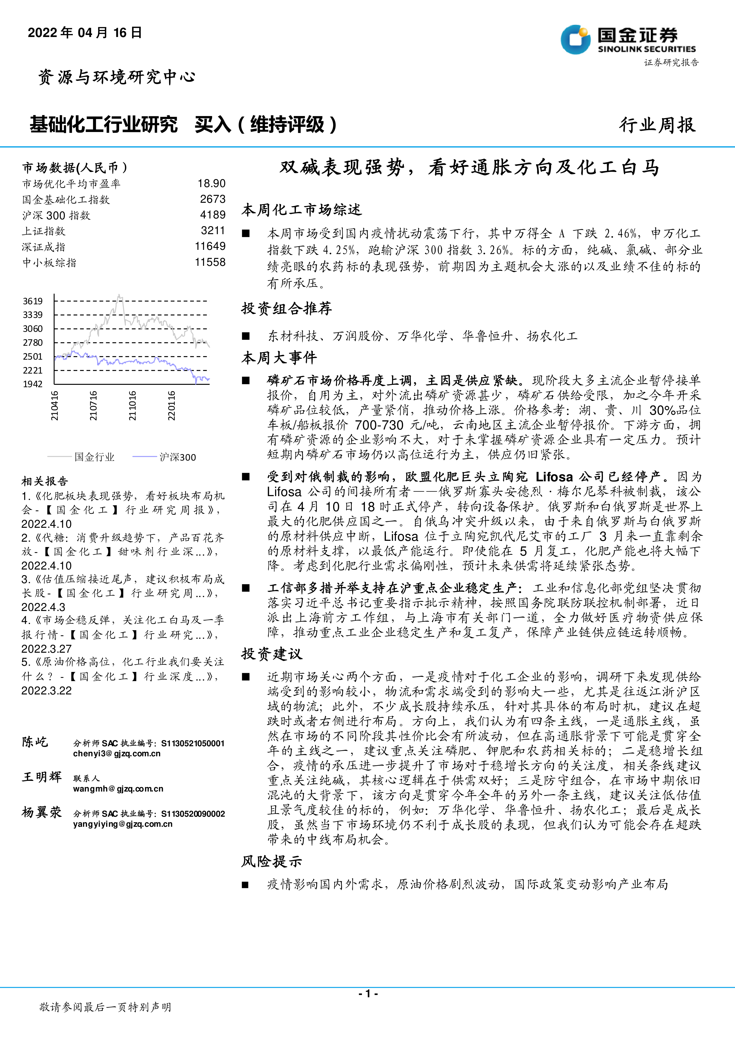 本报告的核心观点是:尽管本周市场受到国内疫情扰动而震荡下行,但双碱表现强势,部分农药标的业绩亮眼。 看好通胀方向及化工白马股的投资机会,建议关注磷肥、钾肥、农药、纯碱等相关标的,以及低估值且景气度较佳的化工白马股。 同时,需关注疫情对物流和需求端的影响,以及成长股的超跌风险。