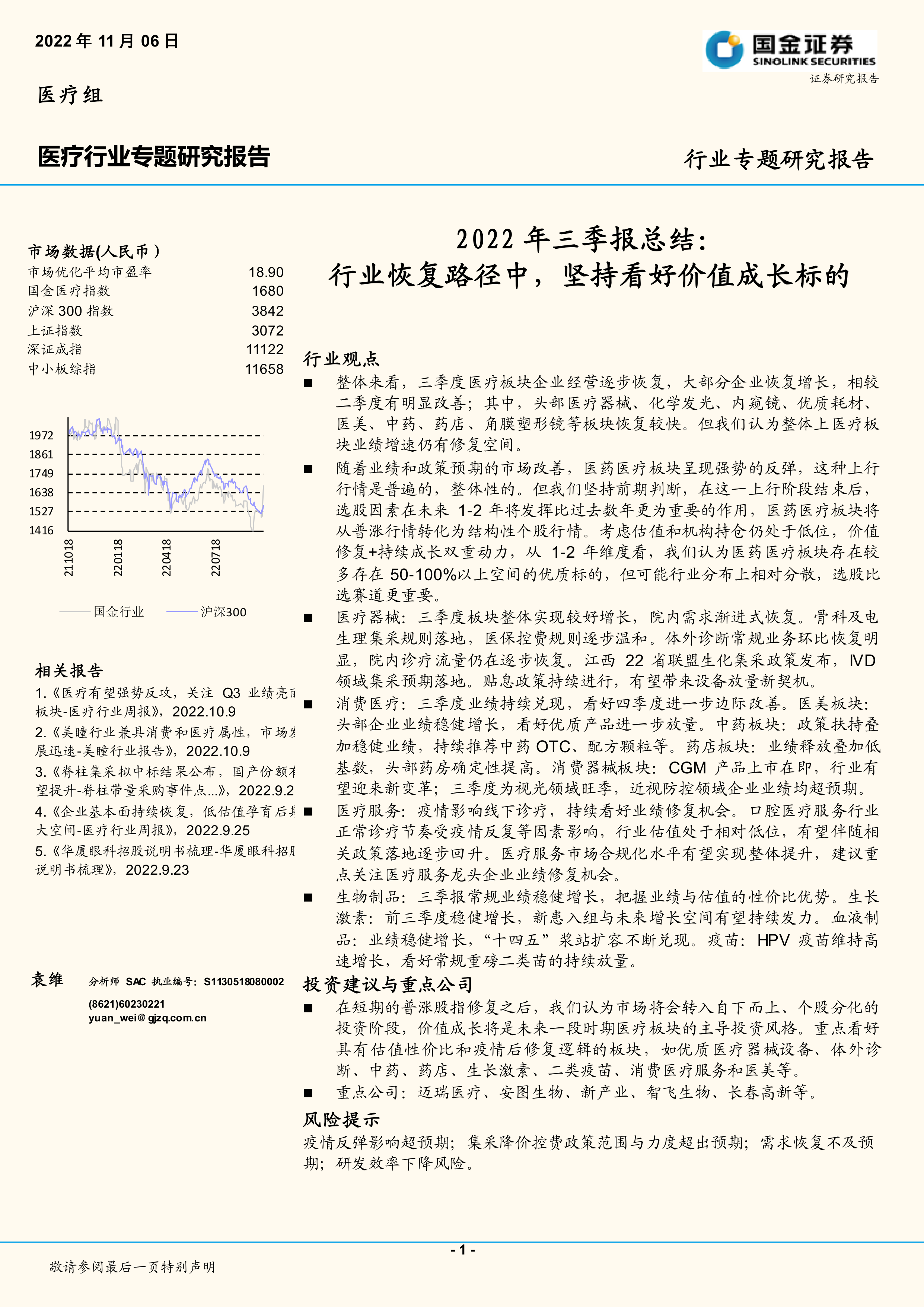 2022年三季度,医疗板块整体呈现复苏态势,但仍存在业绩修复空间。未来1-2年,选股将比选赛道更重要,价值成长将成为投资主导风格。报告建议投资者重点关注优质医疗器械设备、体外诊断、中药、药店、生长激素、二类疫苗、消费医疗服务和医美等板块,并列举了部分重点公司。同时,报告也指出了疫情反弹、集采降价控费、需求恢复不及预期等潜在风险。