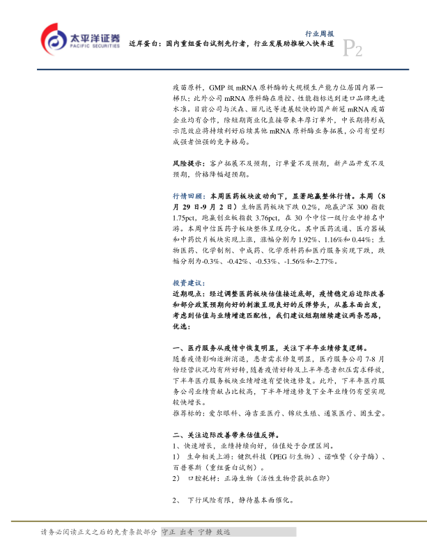 本报告对近岸蛋白公司和医药生物行业进行了深入分析,认为近岸蛋白作为国内重组蛋白试剂的先行者,未来发展前景广阔。同时,报告分析了医药生物行业整体市场行情,并提出了相应的投资建议,为投资者提供了有价值的参考信息。 报告数据显示,医药板块整体估值接近底部,部分细分领域存在投资机会,但同时也提示了政策风险、价格风险、业绩不及预期风险等潜在风险。 投资者应根据自身风险承受能力和投资目标,谨慎决策。