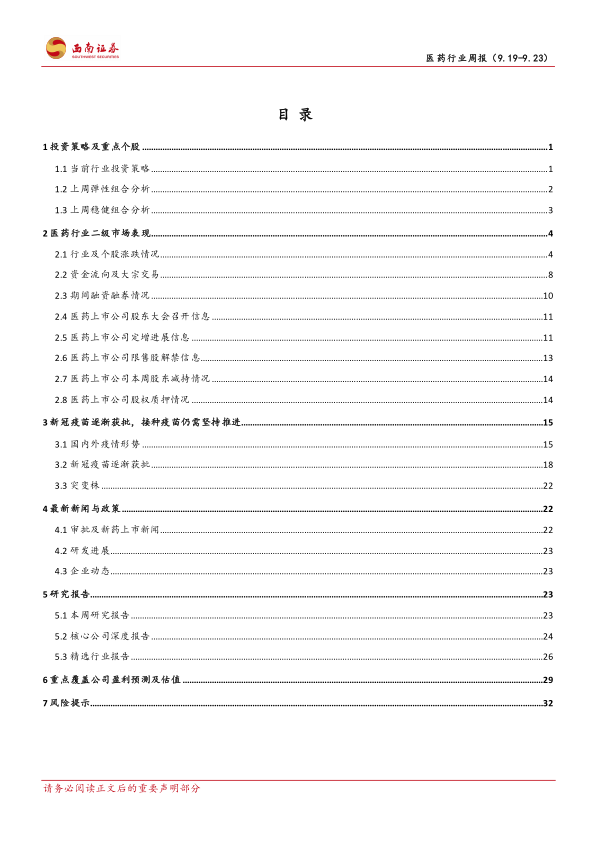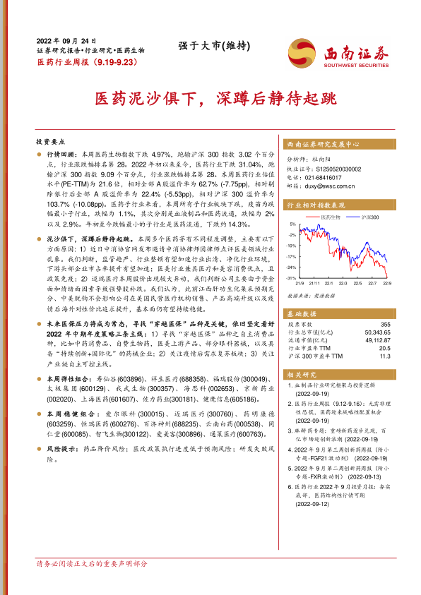 本报告对2022年9月19日至23日医药行业二级市场表现进行了全面分析,并对未来发展趋势进行了展望。报告指出,医药行业目前面临挑战与机遇并存,建议投资者关注“穿越医保”品种、疫情后需求复苏板块以及产业链自主可控主线,并提供了相应的投资建议。报告内容翔实,数据可靠,为投资者提供了有价值的参考信息。 然而,投资者需注意报告中提到的风险提示,并根据自身情况进行投资决策。