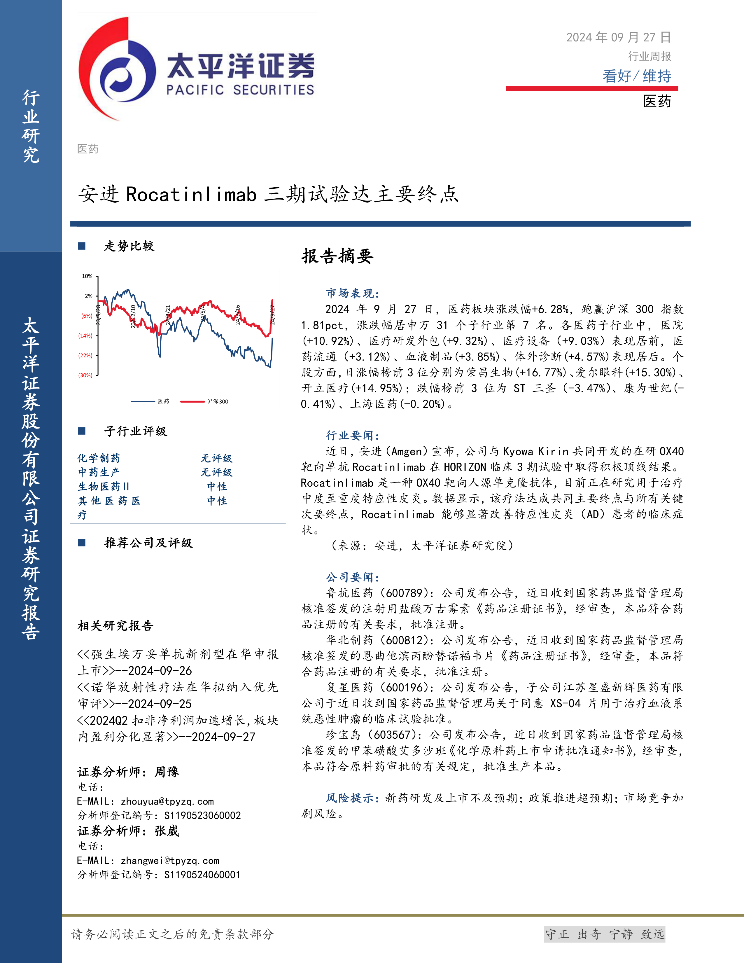 本报告的核心观点是:医药行业整体表现稳健,部分细分领域增长强劲,但整体涨跌幅度相对有限。安进Rocatinlimab三期临床试验成功为行业带来利好消息,部分公司获得药品注册证书也推动了行业发展。然而,市场竞争激烈,个股表现分化明显,投资者需谨慎评估风险。