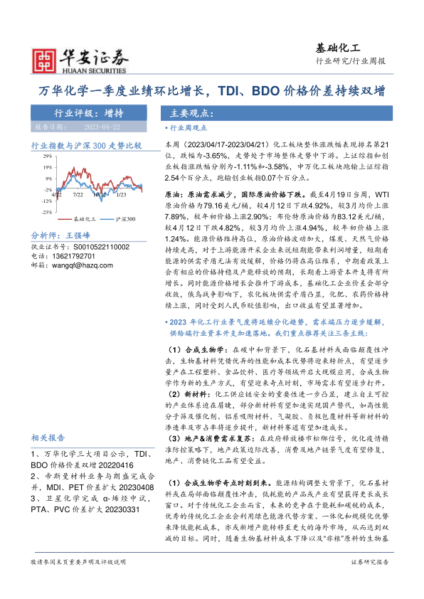 基础化工行业周报:万华化学一季度业绩环比增长,TDI、BDO价格价差持续双增