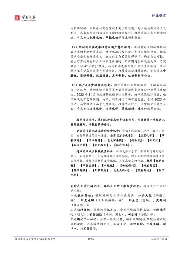 建议关注需求复苏方向投资机会:建议关注纺服、地产、农化、食品、出行等赛道的需求复苏。推荐【万华化学】、【卫星化学】、【华鲁恒升】、【宝丰能源】、【龙佰集团】、【新和成】、【云天化】、【华峰化学】、【巨化股份】、【扬农化工】。