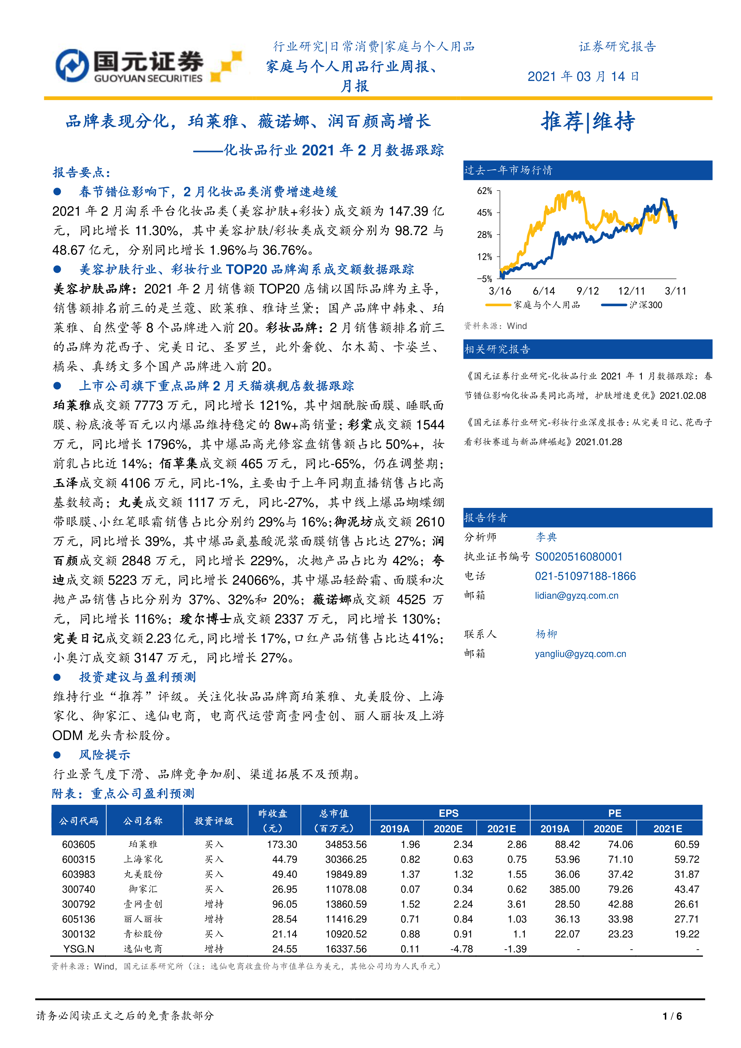 维持行业“推荐”评级。关注化妆品品牌商珀莱雅、丸美股份、上海家化、御家汇、逸仙电商,电商代运营商壹网壹创、丽人丽妆及上游ODM龙头青松股份。