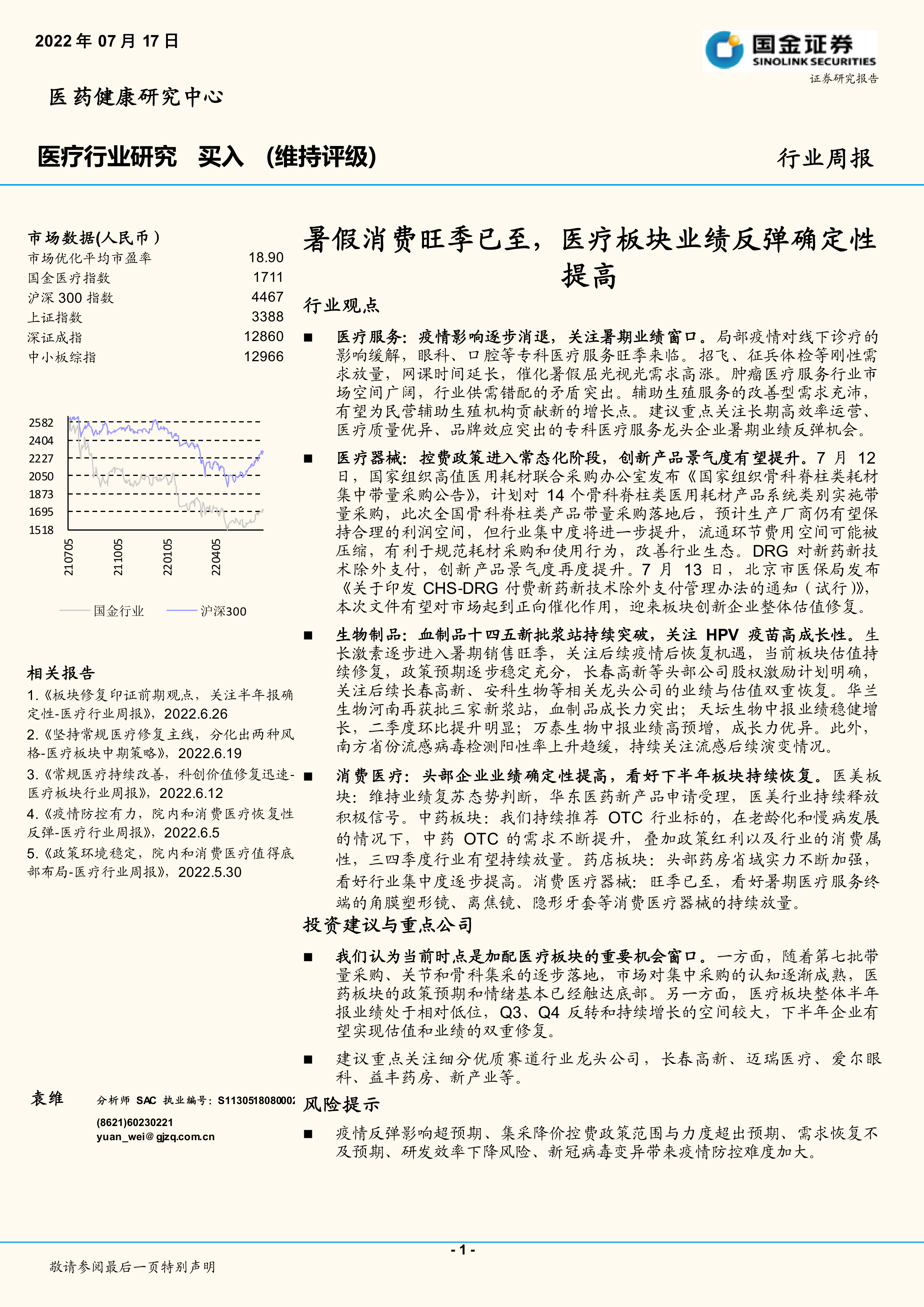 本报告的核心观点是:暑期消费旺季来临,叠加疫情影响逐步消退,医疗板块业绩反弹确定性提高,是加配医疗板块的重要机会窗口。报告从医疗服务、医疗器械、生物制品、消费医疗四个方面,结合市场数据和近期政策变化,分析了医疗行业当前的投资机会和风险。