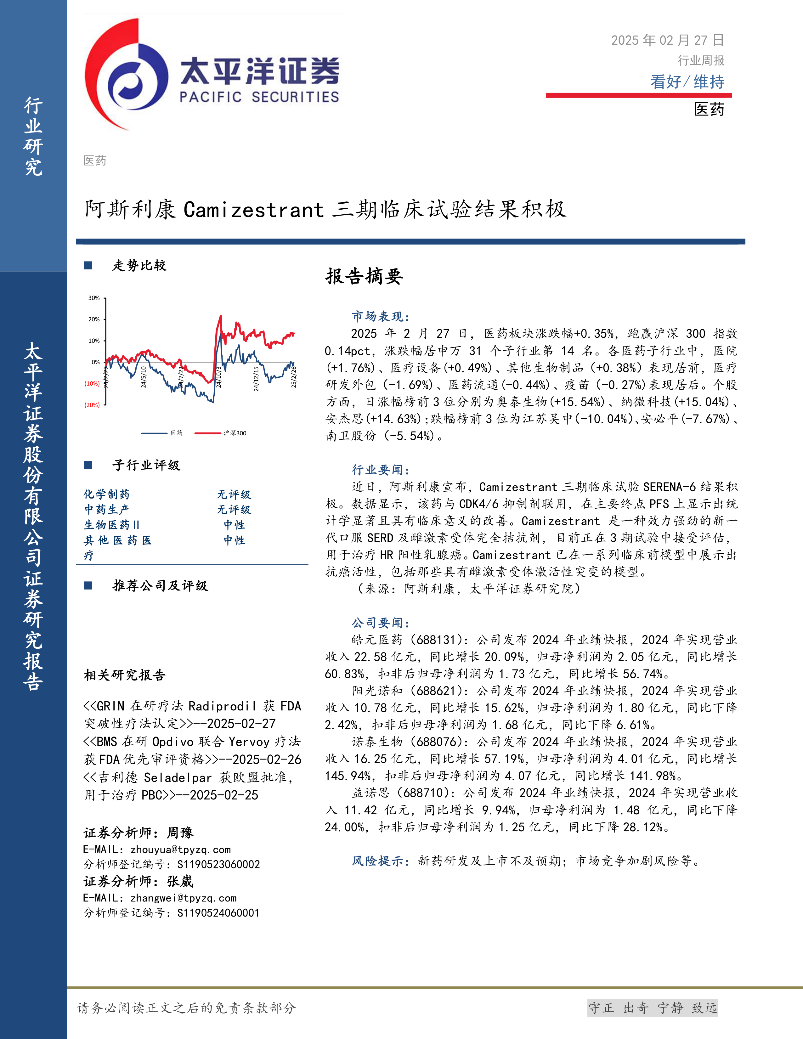 本报告的核心观点是:2025年2月27日,医药板块整体表现略好于大盘,部分子行业和个股涨幅显著,阿斯利康Camizestrant三期临床试验结果积极为行业带来利好消息。然而,部分公司业绩表现分化,需谨慎看待市场走势。