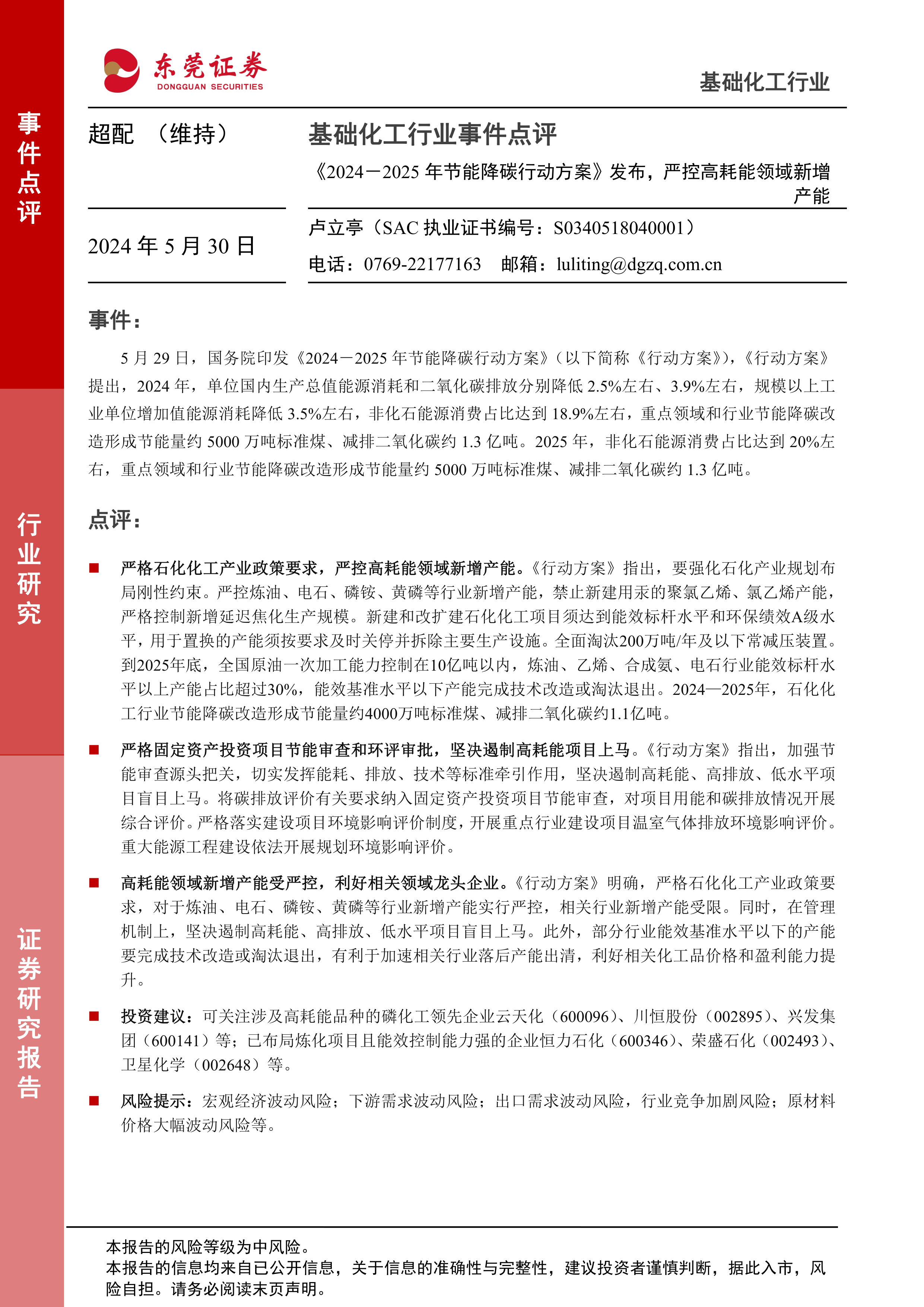 基础化工行业事件点评:《2024-2025年节能降碳行动方案》发布,严控高耗能领域新增产能