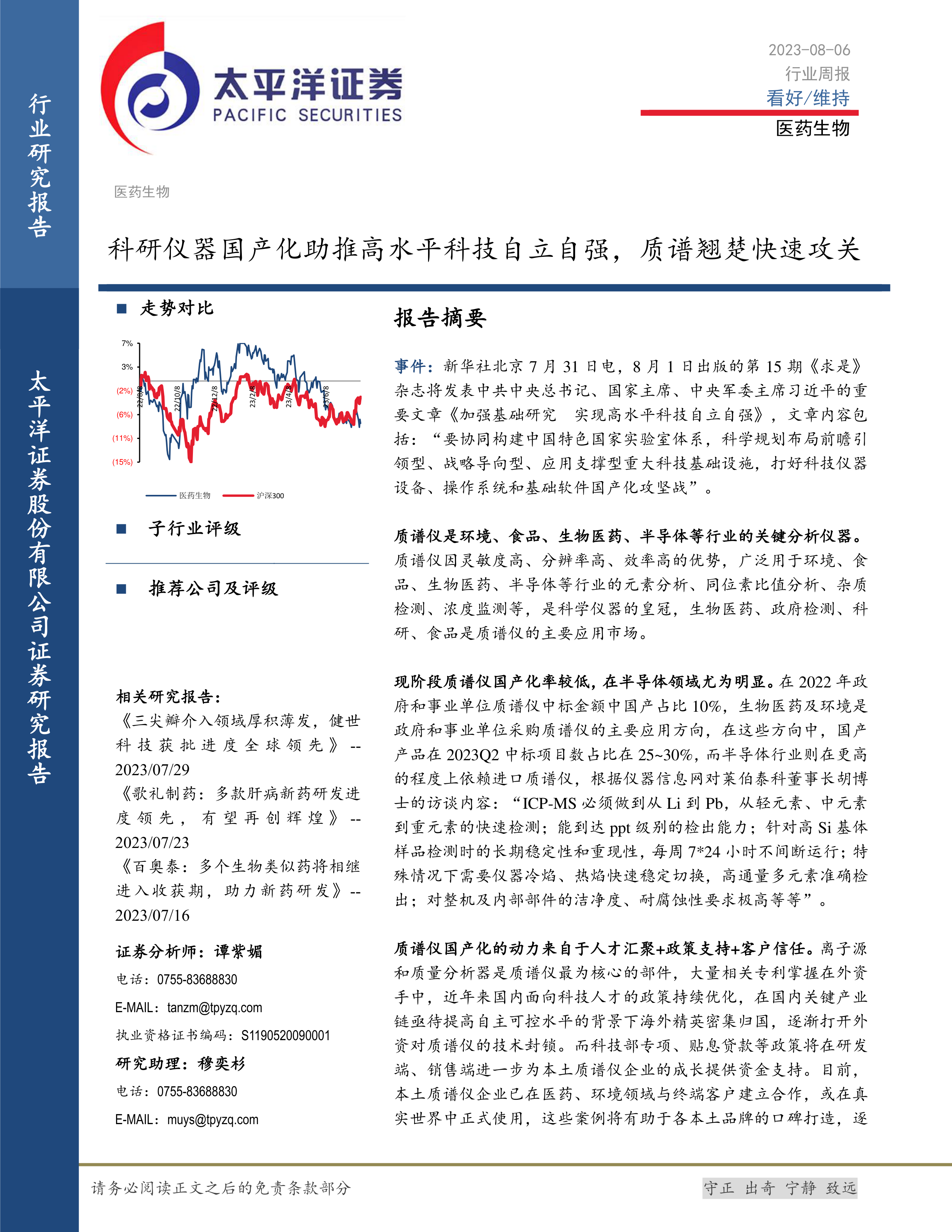 医药生物行业周报:科研仪器国产化助推高水平科技自立自强,质谱翘楚快速攻关