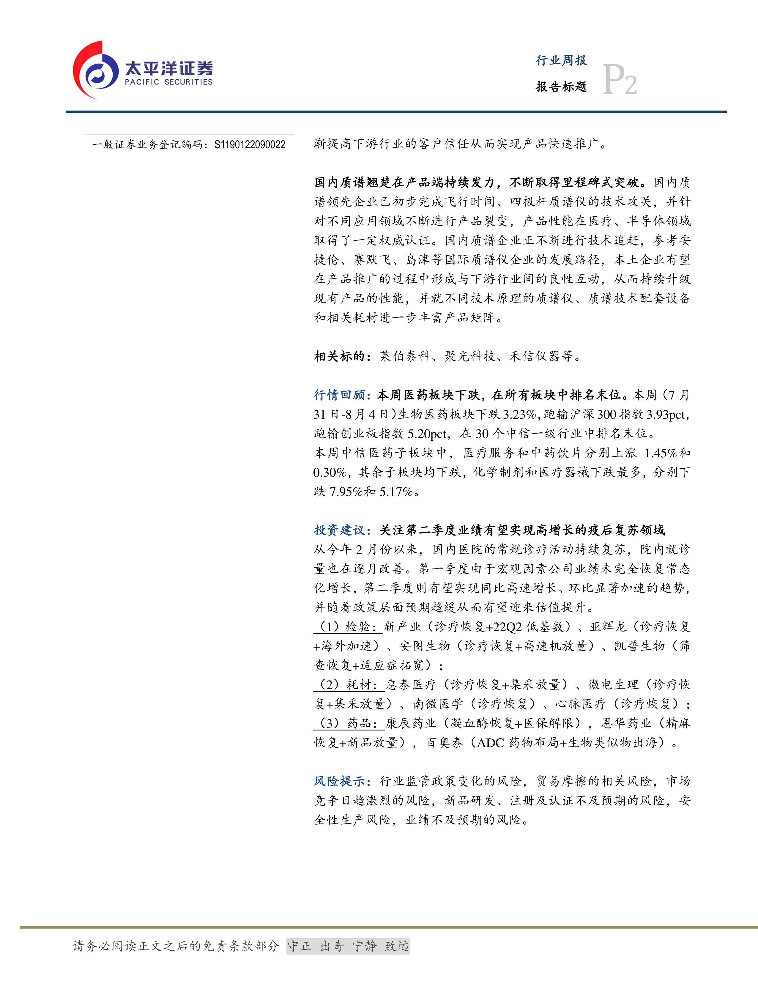 本报告深入分析了国家政策对科研仪器国产化的推动作用,以及质谱仪国产化的发展现状和未来趋势。报告指出,国内质谱仪企业在技术和市场方面取得了显著进展,但仍面临挑战。同时,报告对医药板块的市场行情进行了全面回顾和分析,并根据市场趋势和公司业绩预测,提出了具体的投资建议,为投资者提供了有价值的参考信息。 报告中包含了大量的图表数据,对市场行情和公司业绩进行了量化分析,增强了报告的可信度和专业性。 需要注意的是,报告中的投资建议仅供参考,不构成投资建议,投资者应根据自身情况进行独立判断。