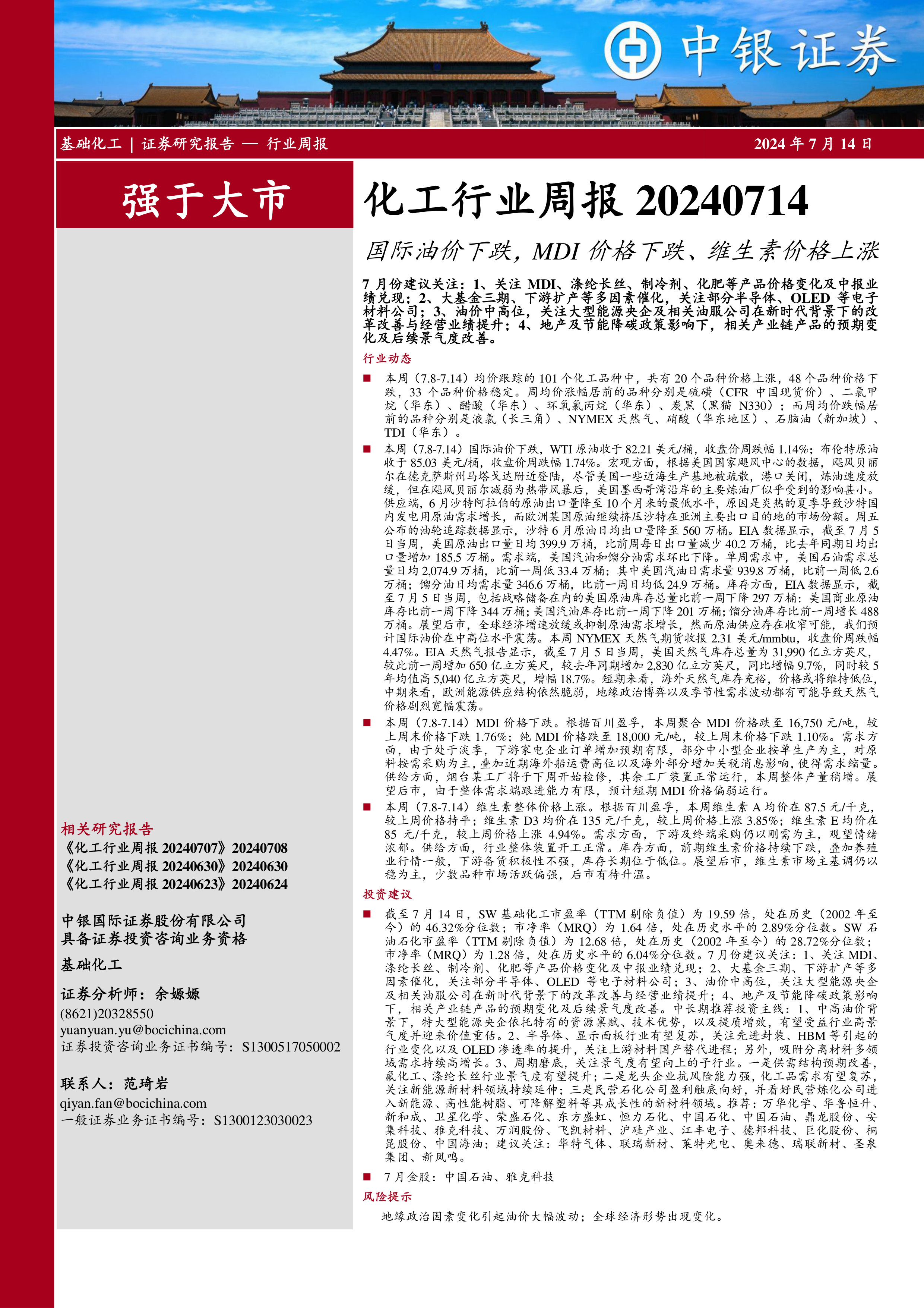 本报告的核心观点是:基础化工行业近期表现分化,部分产品价格上涨,部分产品价格下跌。国际油价下跌对部分化工产品价格造成影响,而维生素等产品价格则出现上涨。报告建议关注MDI、涤纶长丝、制冷剂、化肥等产品价格变化及中报业绩兑现,并看好能源央企、半导体材料、OLED材料以及部分周期性行业龙头企业。