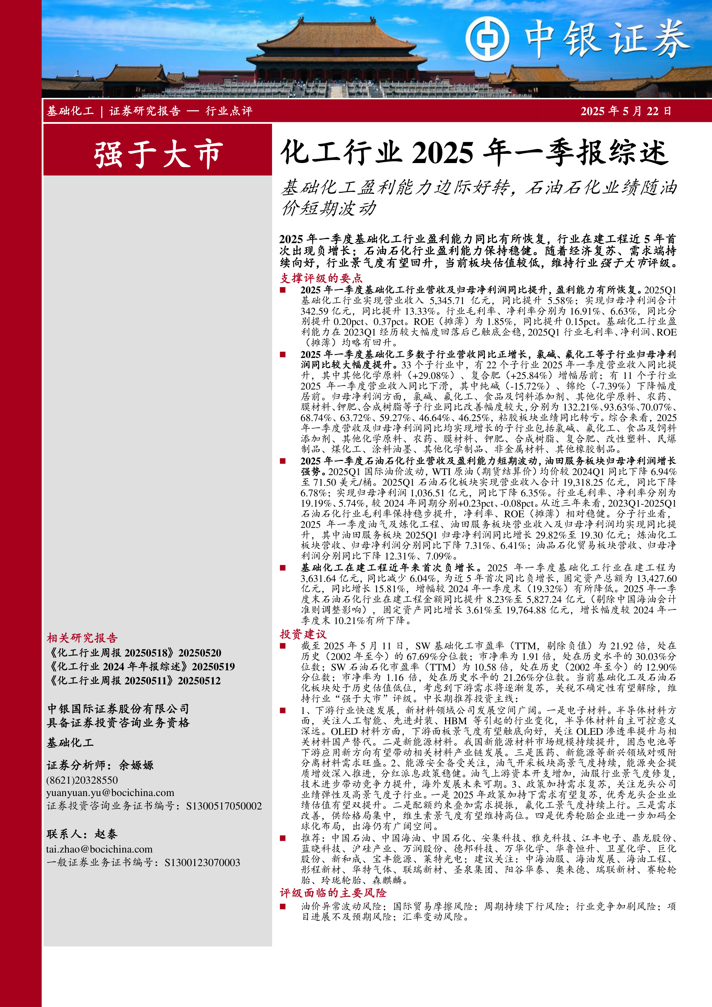 本报告的核心观点是:2025年一季度,基础化工行业盈利能力边际好转,石油石化行业盈利能力保持稳健,行业整体景气度有望回升,当前板块估值较低,维持行业“强于大市”评级。