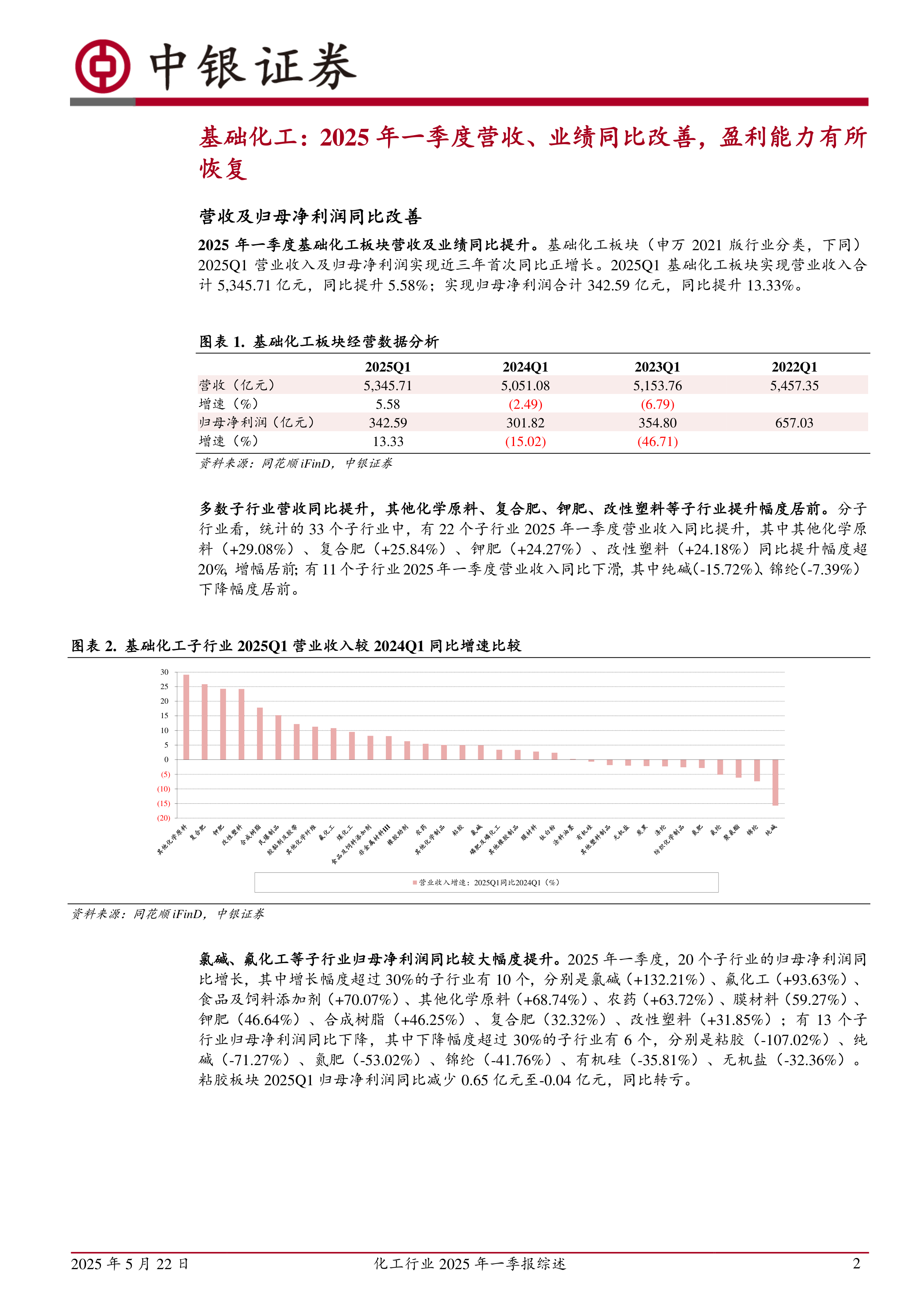 2025年一季度,基础化工板块营收和归母净利润实现近三年首次同比正增长,盈利能力有所恢复。具体数据详见报告图表1。