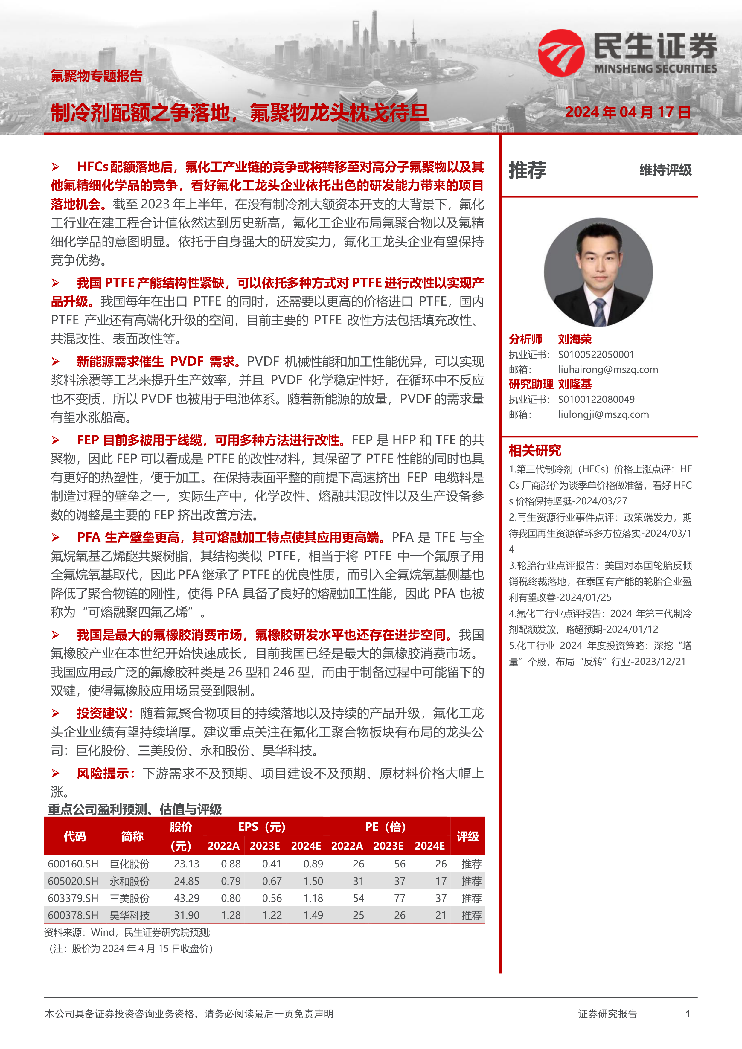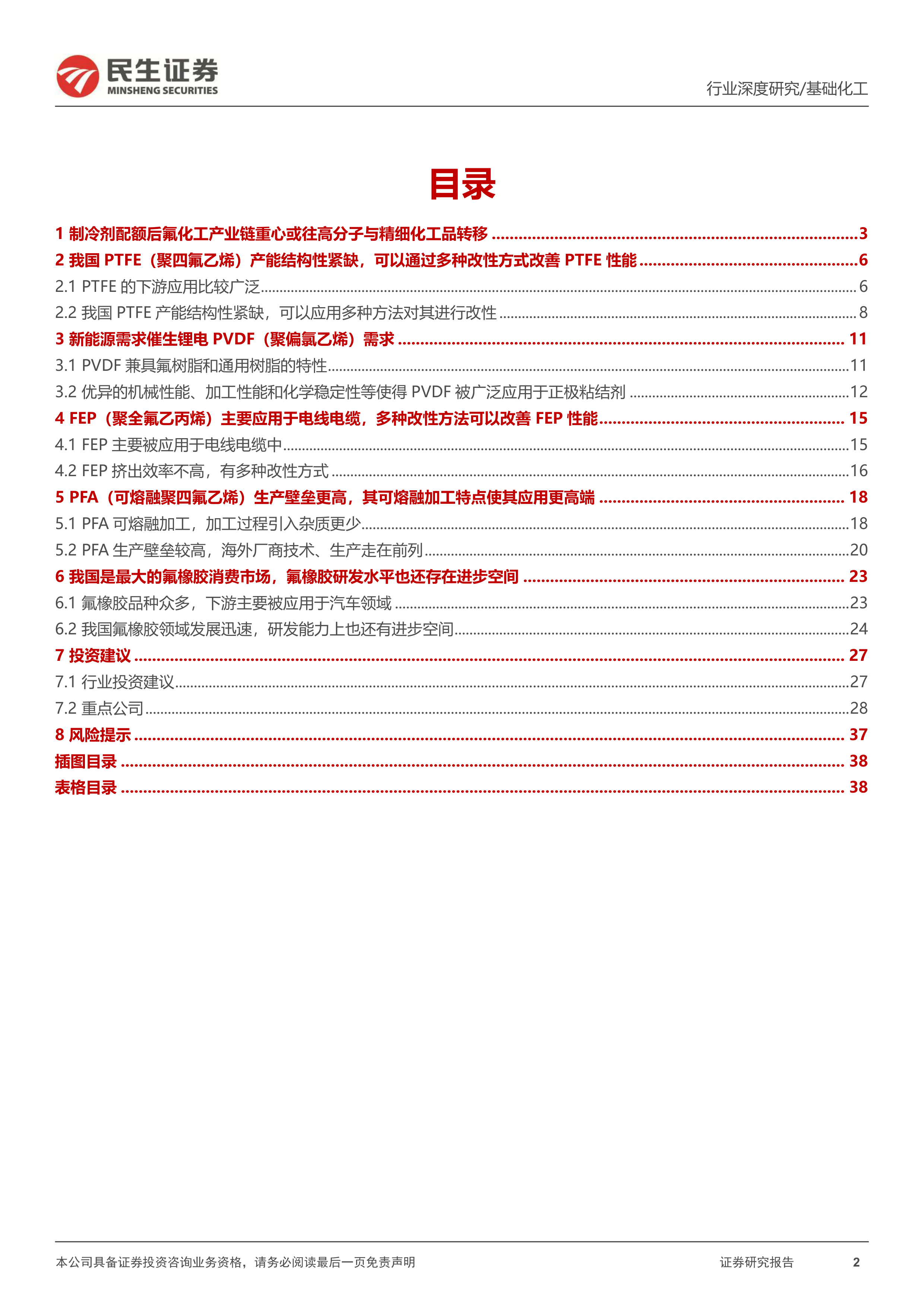 本报告的核心观点是:随着2024年HFCs制冷剂配额政策的落地,中国氟化工产业链的竞争焦点将从制冷剂转向高附加值的氟聚合物及精细化学品。氟化工龙头企业凭借其强大的研发能力和产业链布局,有望在这一转变中获得显著的竞争优势,并实现业绩持续增长。报告重点分析了PTFE、PVDF、FEP、PFA以及氟橡胶等主要氟聚合物材料的市场现状、技术发展趋势以及投资机会,并推荐了巨化股份、三美股份、永和股份和昊华科技四家龙头企业。
