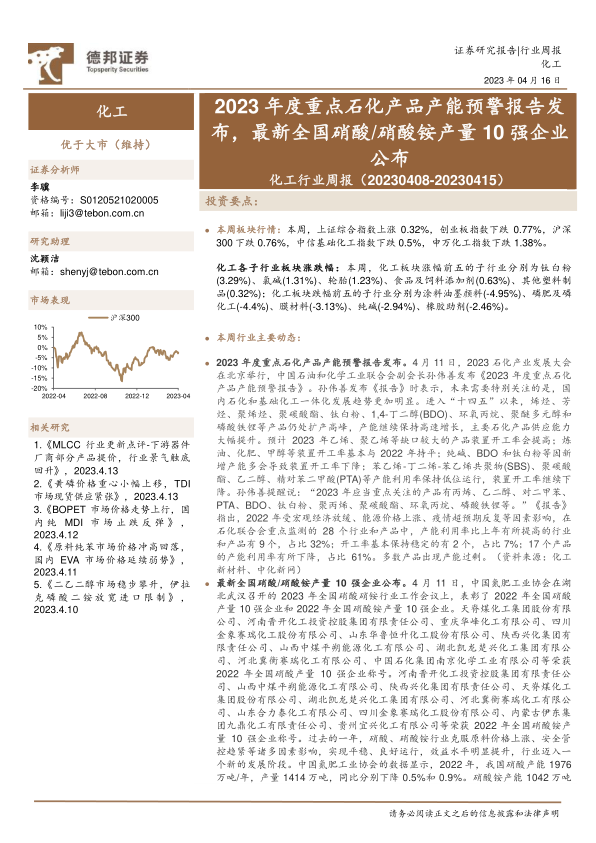 化工行业周报:2023年度重点石化产品产能预警报告发布,最新全国硝酸/硝酸铵产量10强企业公布