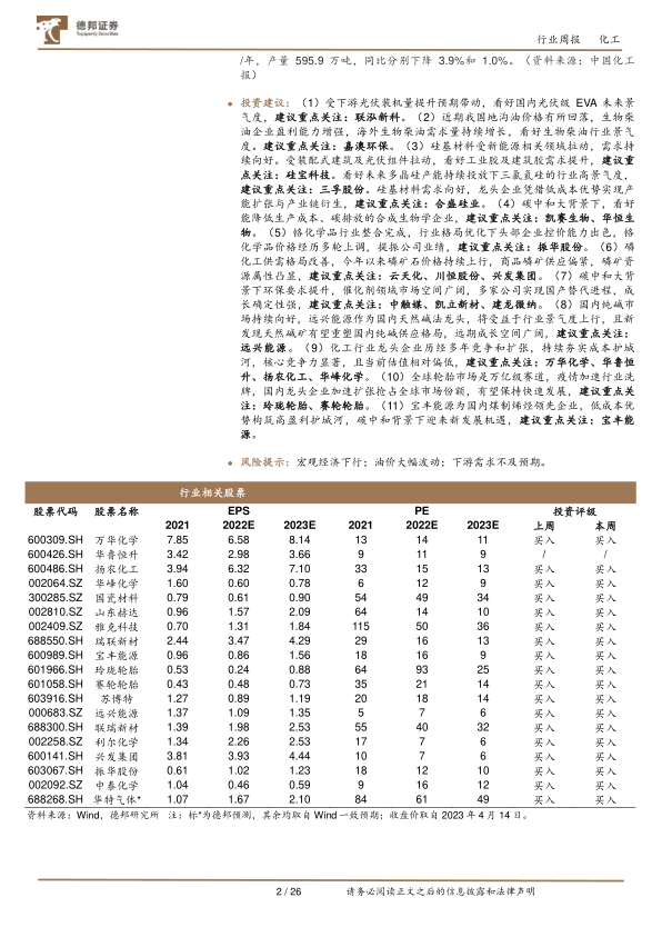投资建议:(1)受下游光伏装机量提升预期带动,看好国内光伏级EVA未来景气度,建议重点关注:联泓新科。(2)近期我国地沟油价格有所回落,生物柴油企业盈利能力增强,海外生物柴油需求量持续增长,看好生物柴油行业景气度。建议重点关注:嘉澳环保。(3)硅基材料受新能源相关领域拉动,需求持续向好。受装配式建筑及光伏组件拉动,看好工业胶及建筑胶需求提升,建议重点关注:硅宝科技。看好未来多晶硅产能持续投放下三氯氢硅的行业高景气度,建议重点关注:三孚股份。硅基材料需求向好,龙头企业凭借低成本优势实现产能扩张与产业链衍生,建议重点关注:合盛硅业。(4)碳中和大背景下,看好能降低生产成本、碳排放的合成生物学企业,建议重点关注:凯赛生物、华恒生物。(5)铬化学品行业整合完成,行业格局优化下头部企业控价能力出色,铬化学品价格经历多轮上调,提振公司业绩,建议重点关注:振华股份。(6)磷化工供需格局改善,今年以来磷矿石价格持续上行,商品磷矿供应偏紧,磷矿资源属性凸显,建议重点关注:云天化、川恒股份、兴发集团。(7)碳中和大背景下环保要求提升,催化剂领域市场空间广阔,多家公司实现国产替代进程,成长确定性强,建议重点关注:中触媒、凯立新材、建龙微纳。(8)国内纯碱市场持续向好,远兴能源作为国内天然碱法龙头,将受益于行业景气度上行,且新发现天然碱矿有望重塑国内纯碱供应格局,远期成长空间广阔,建议重点关注:远兴能源。(9)化工行业龙头企业历经多年竞争和扩张,持续夯实成本护城河,核心竞争力显著,且当前估值相对偏低,建议重点关注:万华化学、华鲁恒升、扬农化工、华峰化学。(10)全球轮胎市场是万亿级赛道,疫情加速行业洗牌,国内龙头企业加速扩张抢占全球市场份额,有望保持快速发展,建议重点关注:玲珑轮胎、赛轮轮胎。(11)宝丰能源为国内煤制烯烃领先企业,低成本优势构筑高盈利护城河,碳中和背景下迎来新发展机遇,建议重点关注:宝丰能源。