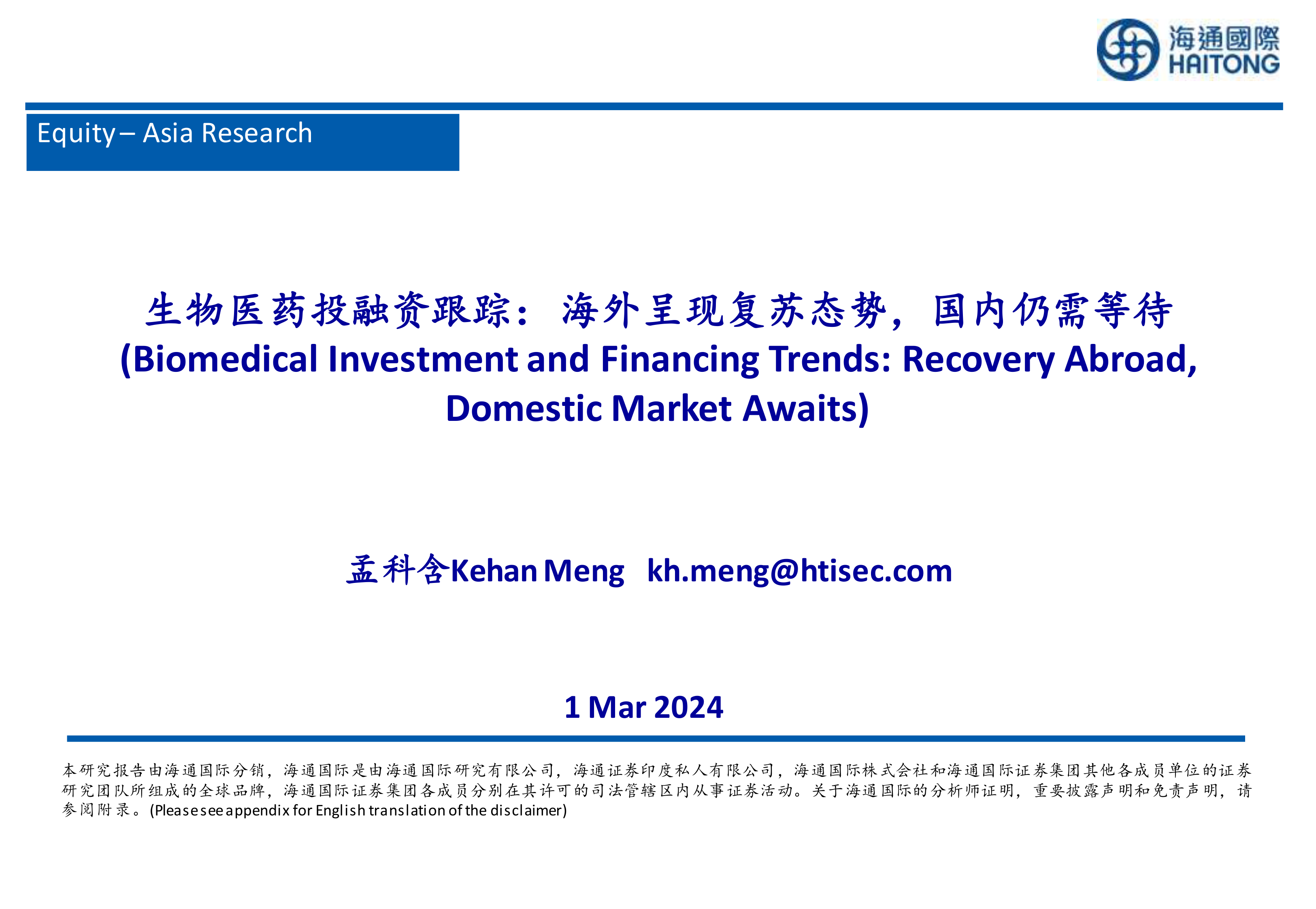 生物医药投融资跟踪:海外呈现复苏态势,国内仍需等待