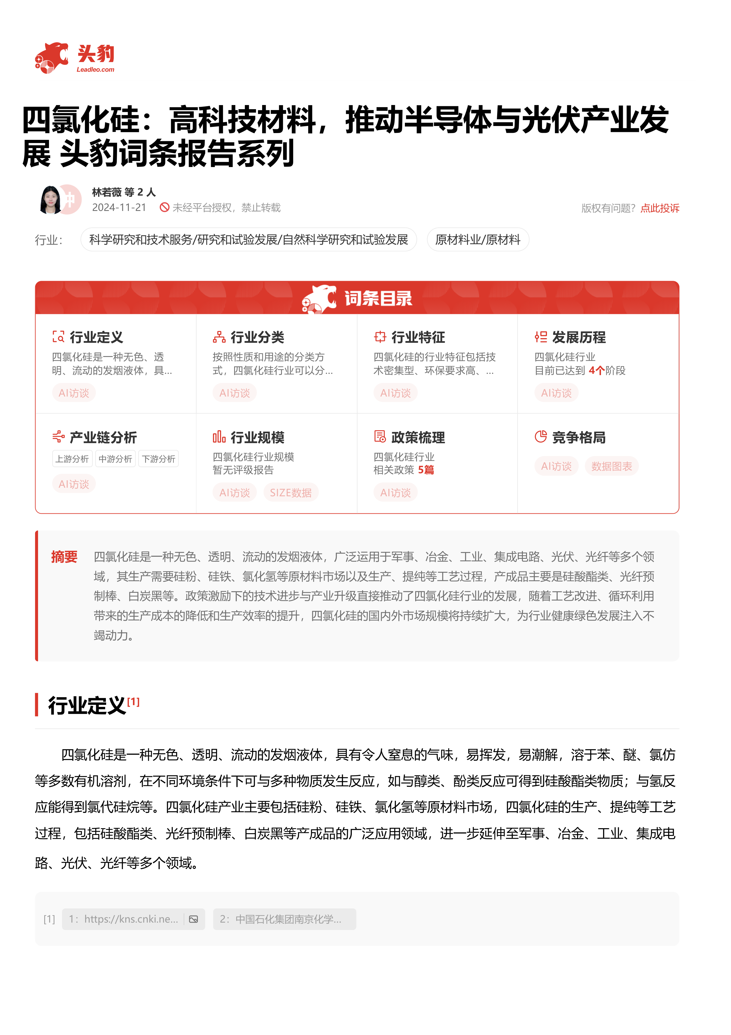 本报告基于Leadleo.com平台发布的《四氯化硅:高科技材料,推动半导体与光伏产业发展》头豹词条报告,对四氯化硅行业进行市场分析。报告核心观点如下: