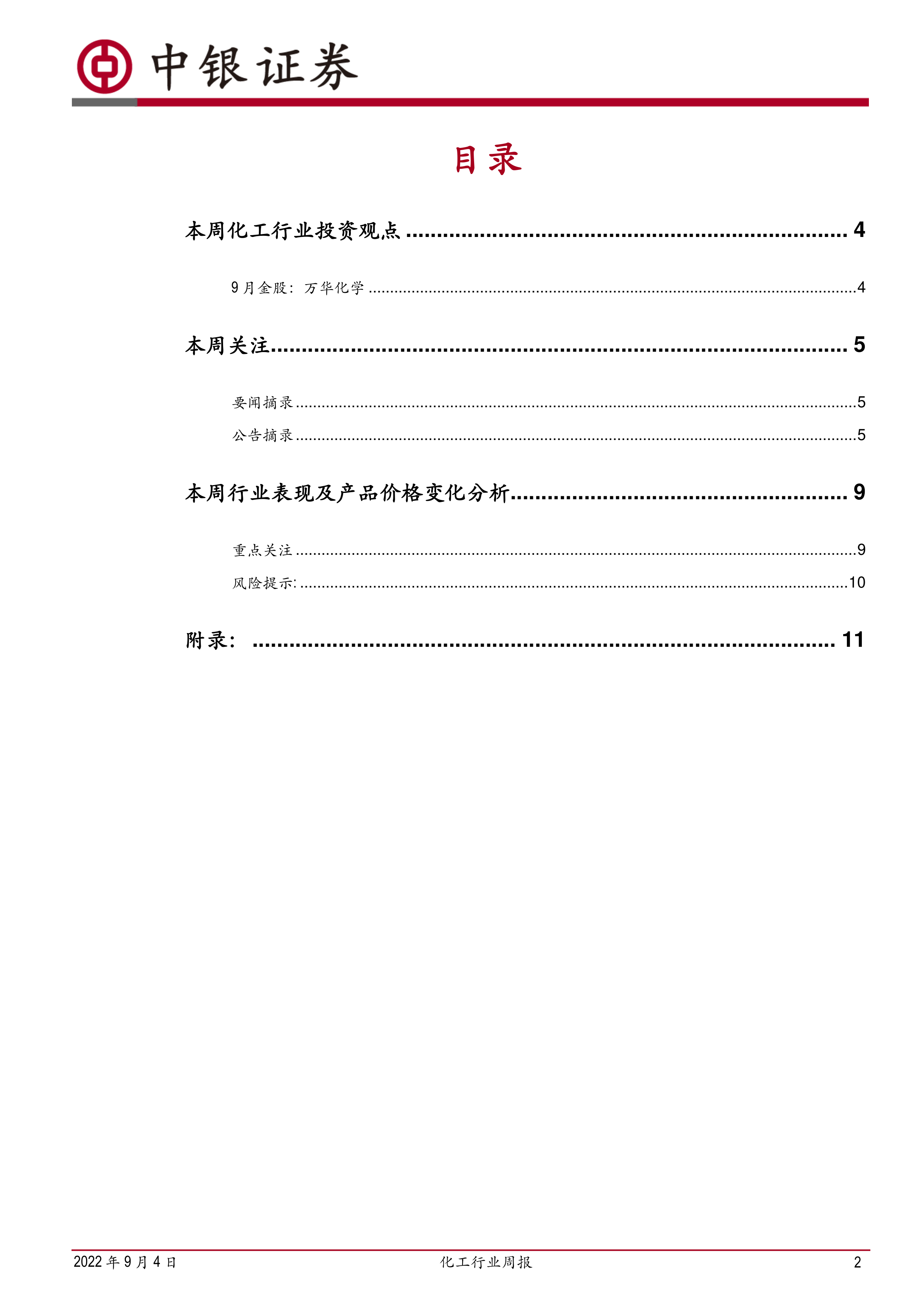 9 月份建议关注:1、能源供应危机下海外产能受限的化工品种;2、金九银十来临,关注未来稳增长落地对于聚氨酯、纯碱、基建化学品等产品的需求拉动;从子行业景气度角度,上游石化炼化、农产品相关农化、磷化工、基建相关化工品、半导体材料、新能源材料等预计维持较高景气。