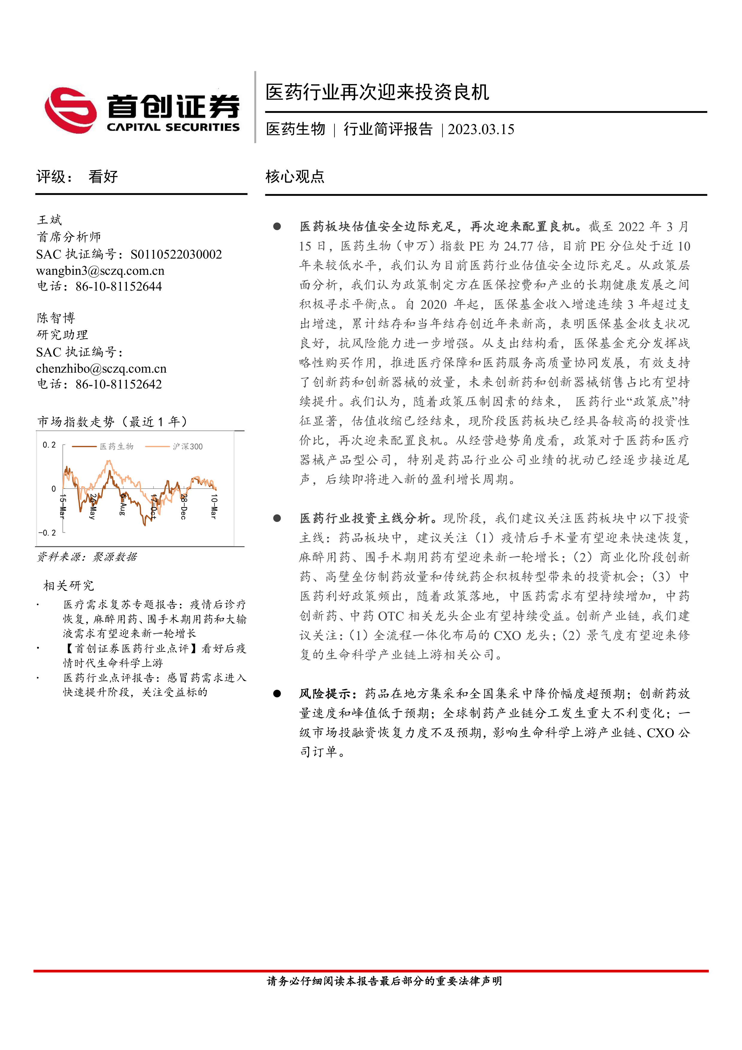 风险提示:药品在地方集采和全国集采中降价幅度超预期;创新药放量速度和峰值低于预期;全球制药产业链分工发生重大不利变化;一级市场投融资恢复力度不及预期,影响生命科学上游产业链、CXO公司订单。