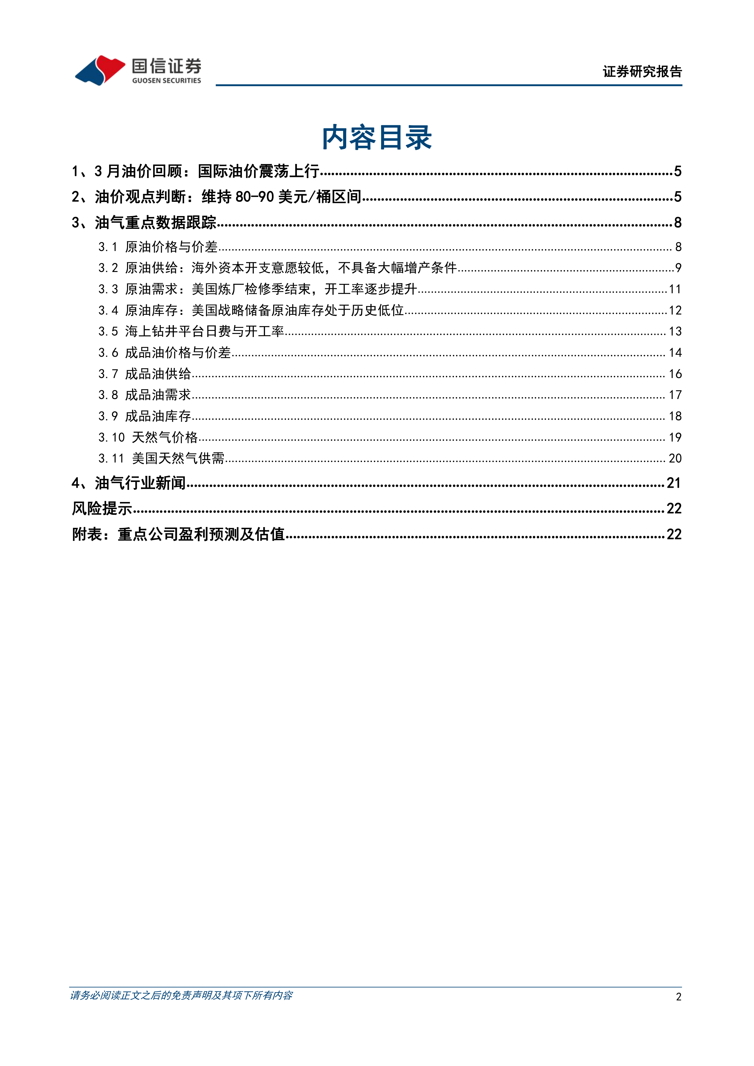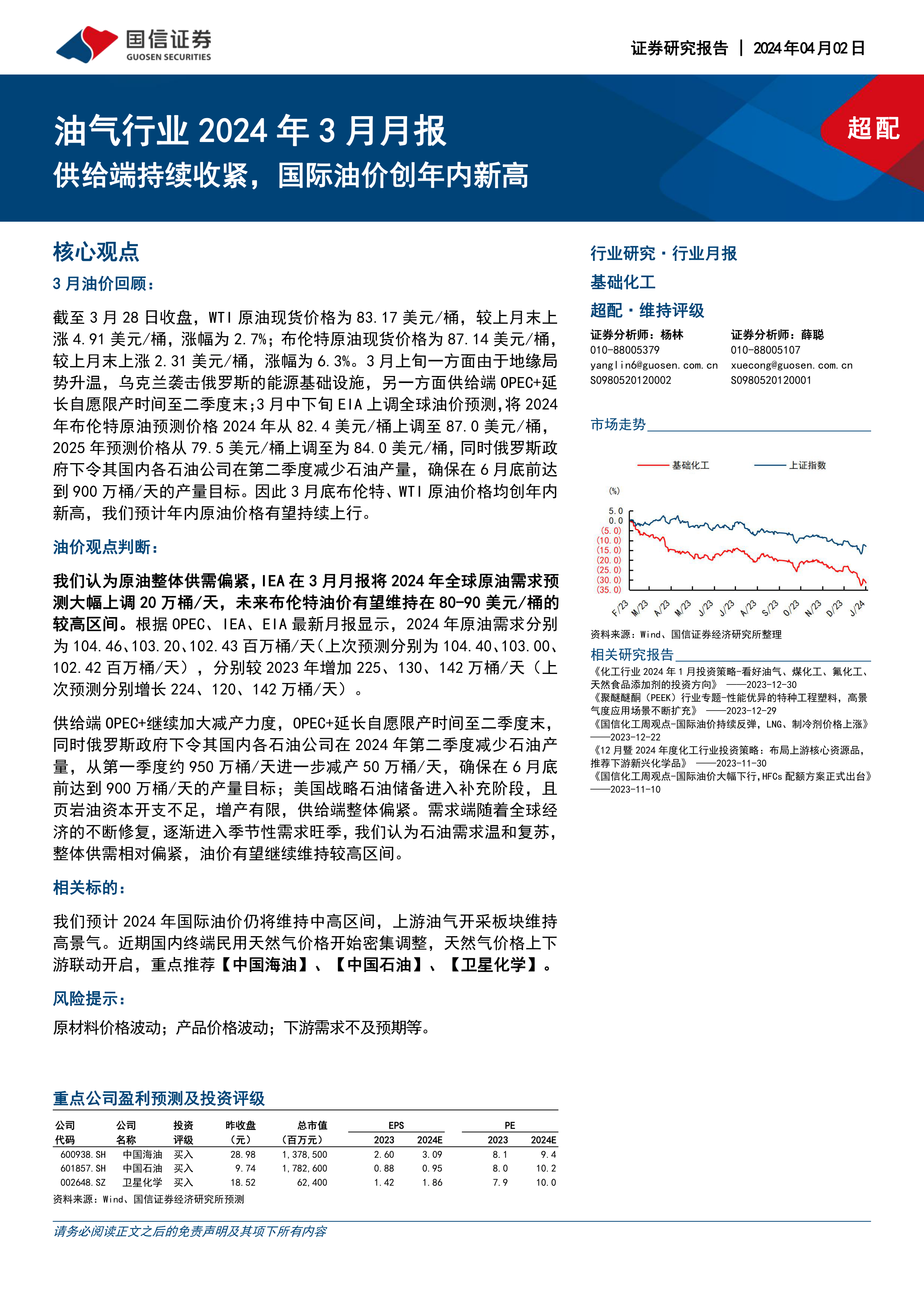 本报告基于对2024年3月油气市场数据的分析,认为国际油价将维持在80-90美元/桶的高位区间。供给端持续收紧是油价上涨的主要驱动力,而需求端的温和复苏进一步巩固了这一趋势。报告推荐投资者关注上游油气开采板块,并重点推荐中国海油、中国石油和卫星化学等相关标的。 然而,报告也提示了原材料价格波动、产品价格波动以及下游需求不及预期等风险。 报告中大量的数据和图表清晰地展现了油气市场供需关系的动态变化,为投资者提供了较为全面的市场分析和投资建议。