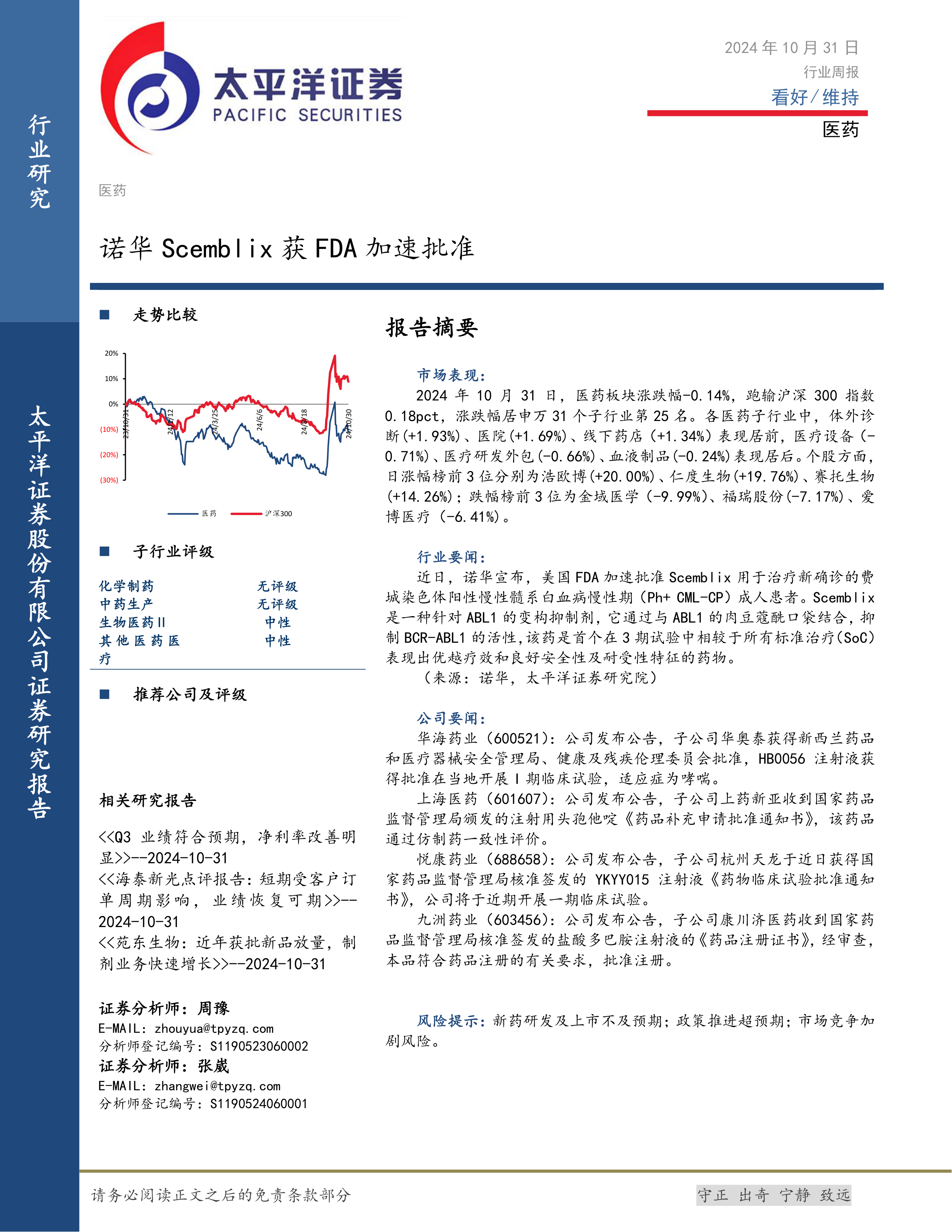 本报告的核心观点是:2024年10月31日,医药板块整体表现略逊于沪深300指数,但个股表现分化明显。诺华Scemblix获FDA加速批准是行业重要利好消息,部分公司在临床试验和药品注册方面取得进展,显示出医药行业持续发展的潜力。然而,市场竞争激烈,新药研发和上市存在不确定性,投资者需谨慎。