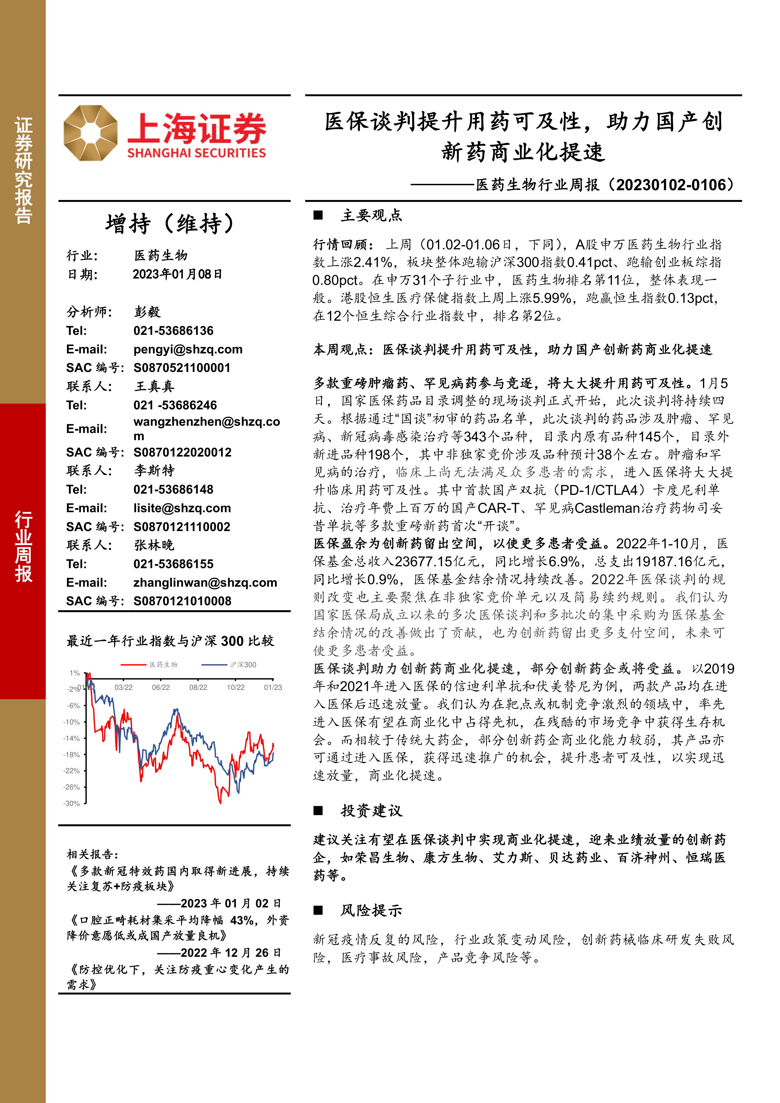 本周观点:医保谈判提升用药可及性,助力国产创新药商业化提速多款重磅肿瘤药、罕见病药参与竞逐,将大大提升用药可及性。1月5日,国家医保药品目录调整的现场谈判正式开始,此次谈判将持续四天。根据通过“国谈”初审的药品名单,此次谈判的药品涉及肿瘤、罕见病、新冠病毒感染治疗等343个品种,目录内原有品种145个,目录外新进品种198个,其中非独家竞价涉及品种预计38个左右。肿瘤和罕见病的治疗,临床上尚无法满足众多患者的需求,进入医保将大大提升临床用药可及性。其中首款国产双抗(PD-1/CTLA4)卡度尼利单抗、治疗年费上百万的国产CAR-T、罕见病Castleman治疗药物司妥昔单抗等多款重磅新药首次“开谈”。