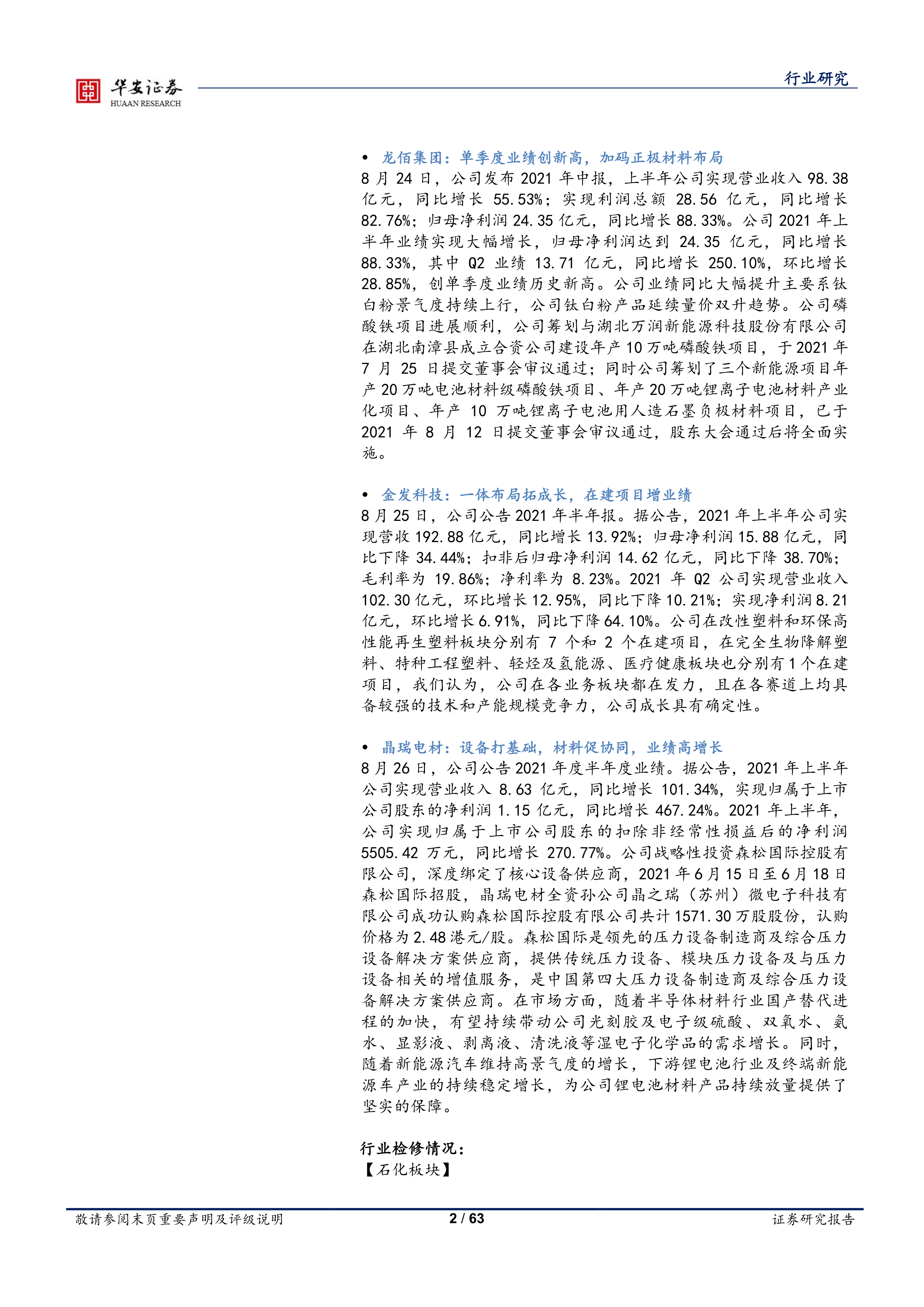 8月24日,公司发布2021年中报,上半年公司实现营业收入98.38亿元,同比增长55.53%;实现利润总额28.56亿元,同比增长82.76%;归母净利润24.35亿元,同比增长88.33%。公司2021年上半年业绩实现大幅增长,归母净利润达到24.35亿元,同比增长88.33%,其中Q2业绩13.71亿元,同比增长250.10%,环比增长28.85%,创单季度业绩历史新高。公司业绩同比大幅提升主要系钛白粉景气度持续上行,公司钛白粉产品延续量价双升趋势。公司磷酸铁项目进展顺利,公司筹划与湖北万润新能源科技股份有限公司在湖北南漳县成立合资公司建设年产10万吨磷酸铁项目,于2021年7月25日提交董事会审议通过;同时公司筹划了三个新能源项目年产20万吨电池材料级磷酸铁项目、年产20万吨锂离子电池材料产业化项目、年产10万吨锂离子电池用人造石墨负极材料项目,已于2021年8月12日提交董事会审议通过,股东大会通过后将全面实施。