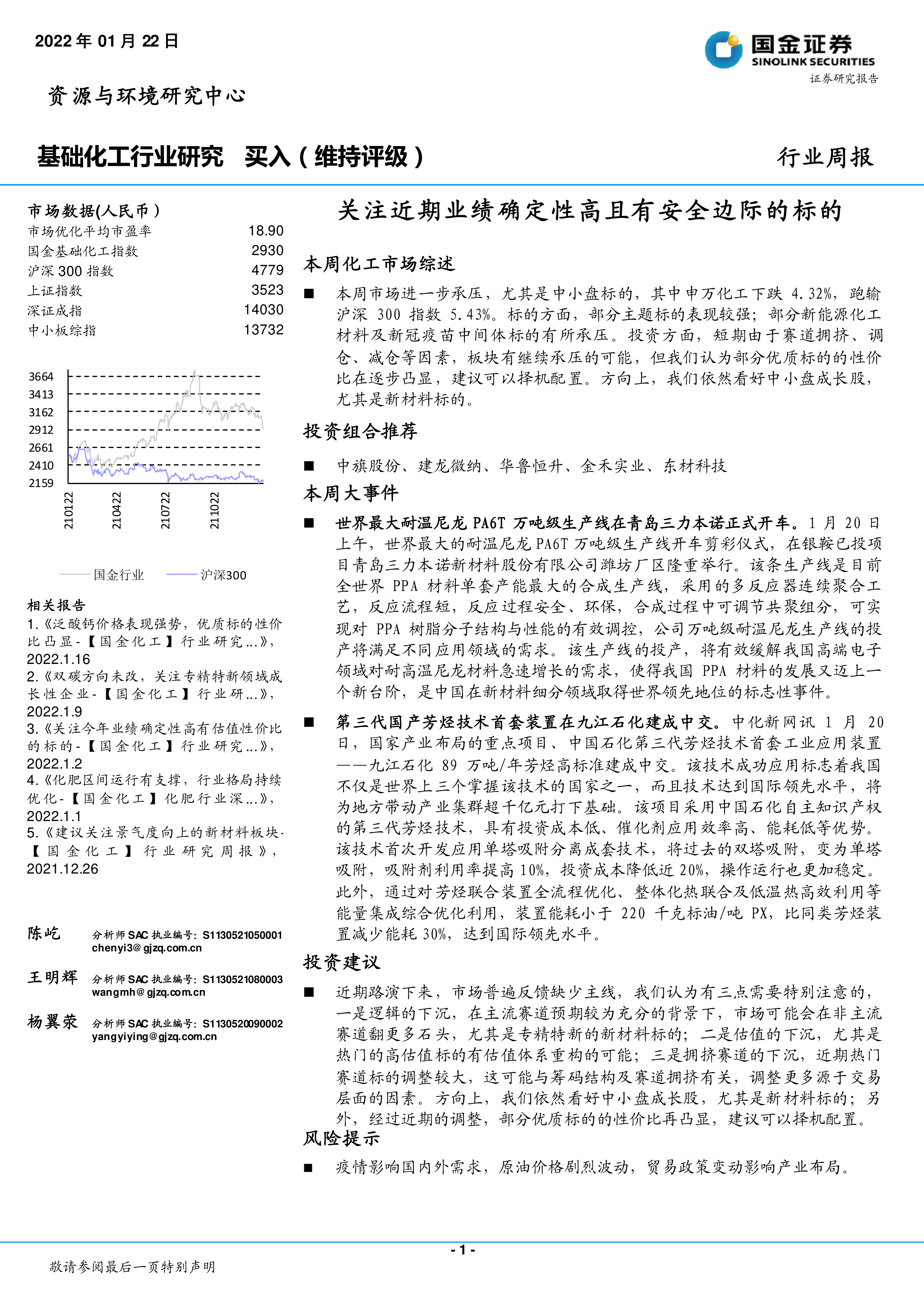 本周市场进一步承压,尤其是中小盘标的,其中申万化工下跌4.32%,跑输沪深300指数5.43%。标的方面,部分主题标的表现较强;部分新能源化工材料及新冠疫苗中间体标的有所承压。投资方面,短期由于赛道拥挤、调仓、减仓等因素,板块有继续承压的可能,但我们认为部分优质标的的性价比在逐步凸显,建议可以择机配置。方向上,我们依然看好中小盘成长股,尤其是新材料标的。