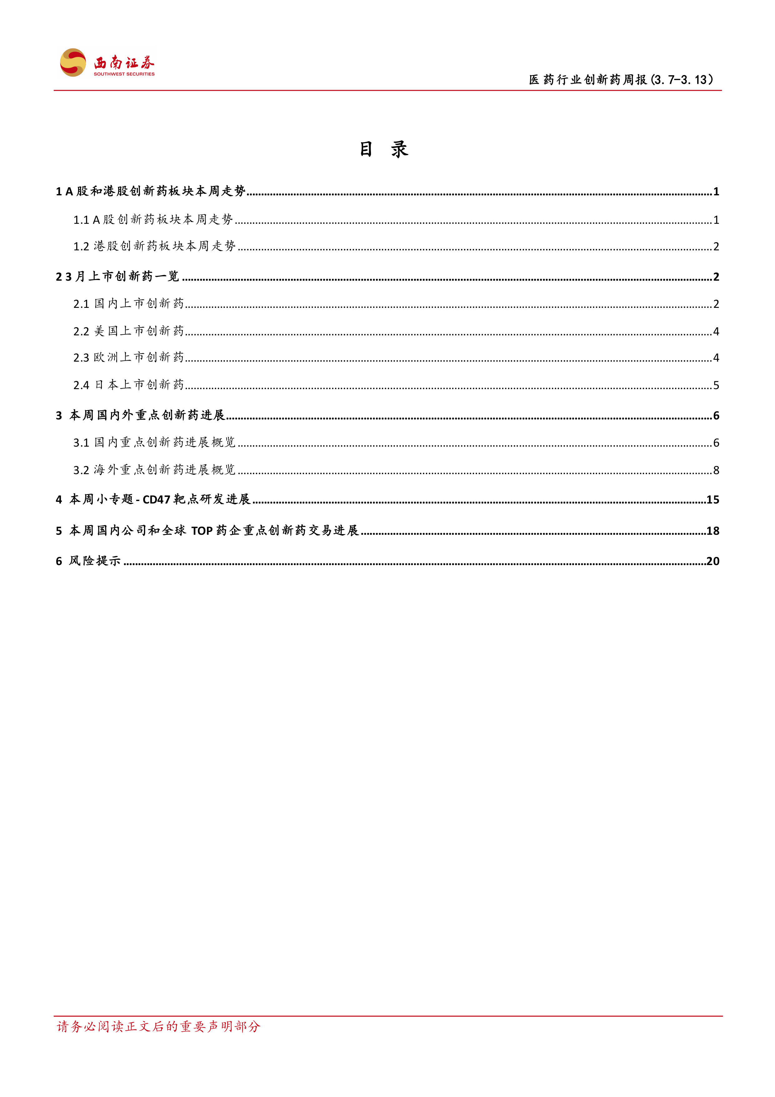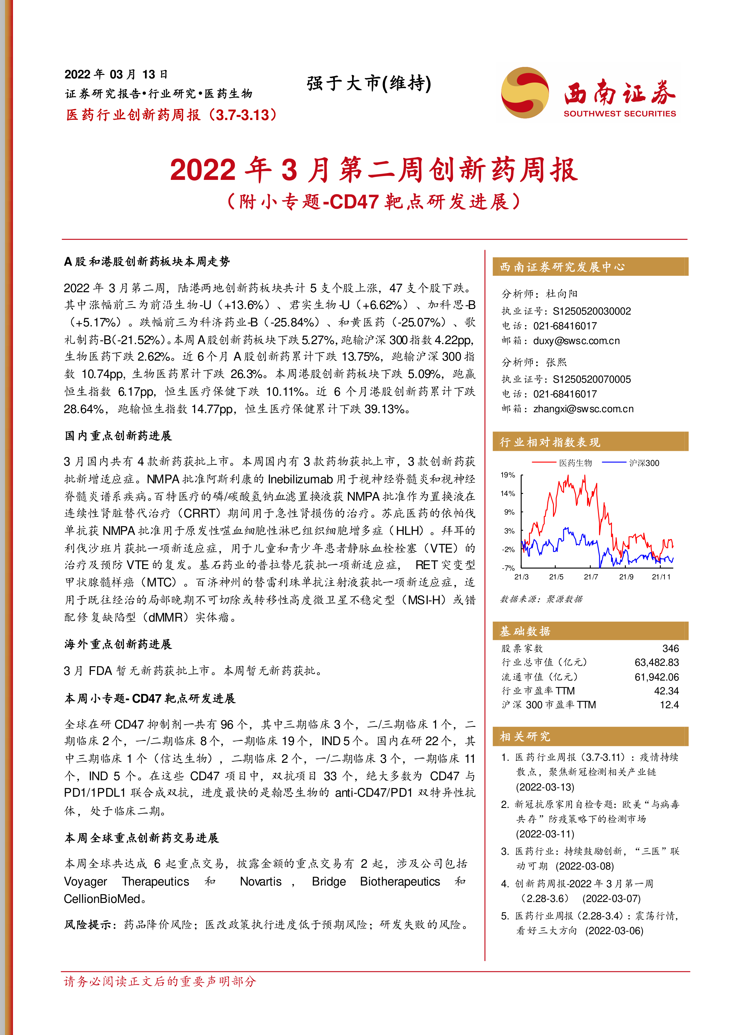 本报告对2022年3月7日至13日A股和港股创新药板块的市场表现、国内外新药审批进展、重点创新药研发进展以及创新药交易情况进行了全面分析。尽管市场整体表现低迷,但国内新药审批进展积极,CD47靶点药物研发进展迅速,为投资者提供了重要的市场信息和投资参考。 需要注意的是,医药行业存在药品降价、医改政策执行进度低于预期以及研发失败等风险。投资者需谨慎决策。