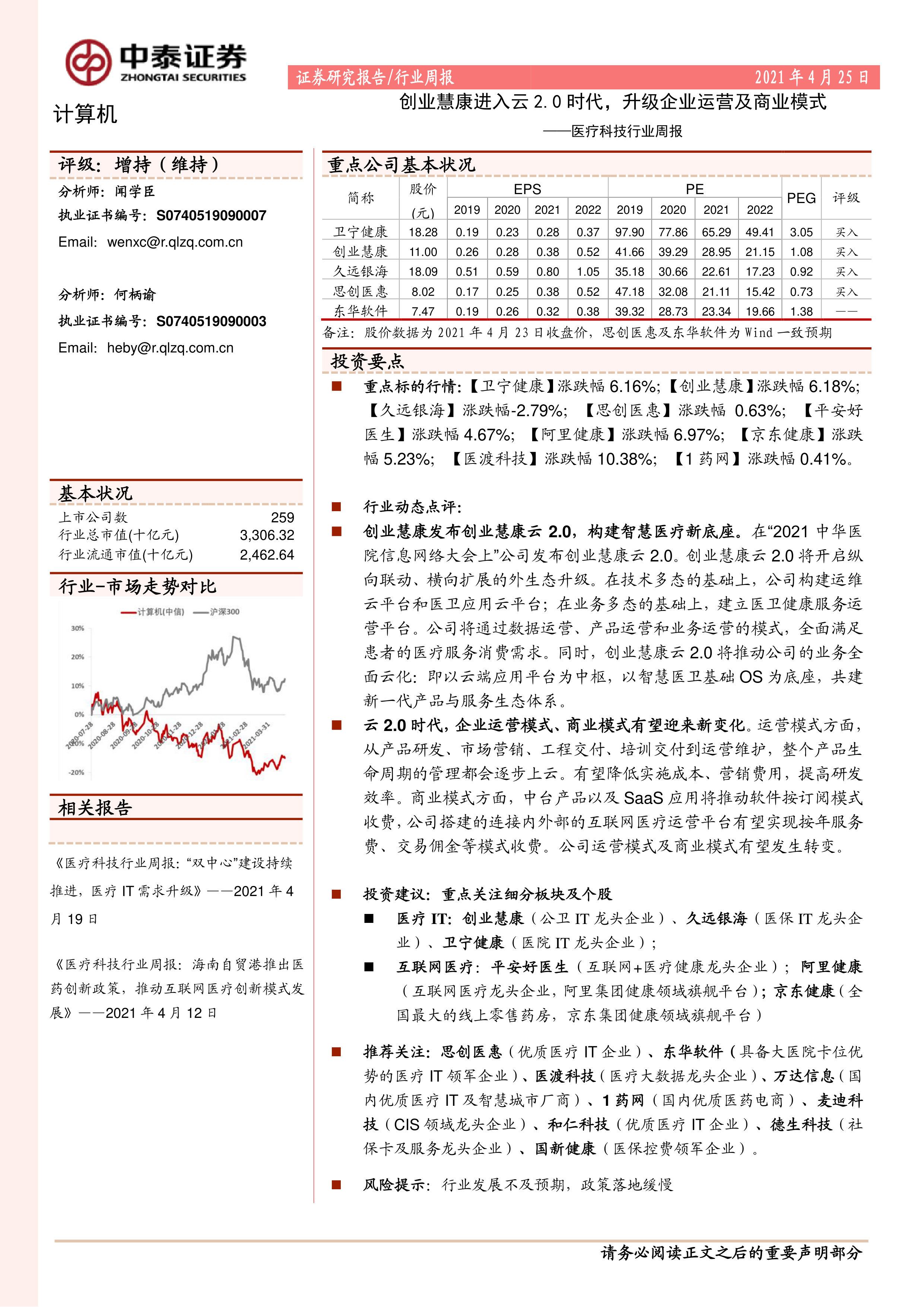创业慧康发布创业慧康云2.0,构建智慧医疗新底座。在“2021中华医院信息网络大会上”公司发布创业慧康云2.0。创业慧康云2.0将开启纵向联动、横向扩展的外生态升级。在技术多态的基础上,公司构建运维云平台和医卫应用云平台;在业务多态的基础上,建立医卫健康服务运营平台。公司将通过数据运营、产品运营和业务运营的模式,全面满足患者的医疗服务消费需求。同时,创业慧康云2.0将推动公司的业务全面云化:即以云端应用平台为中枢,以智慧医卫基础OS为底座,共建新一代产品与服务生态体系。
