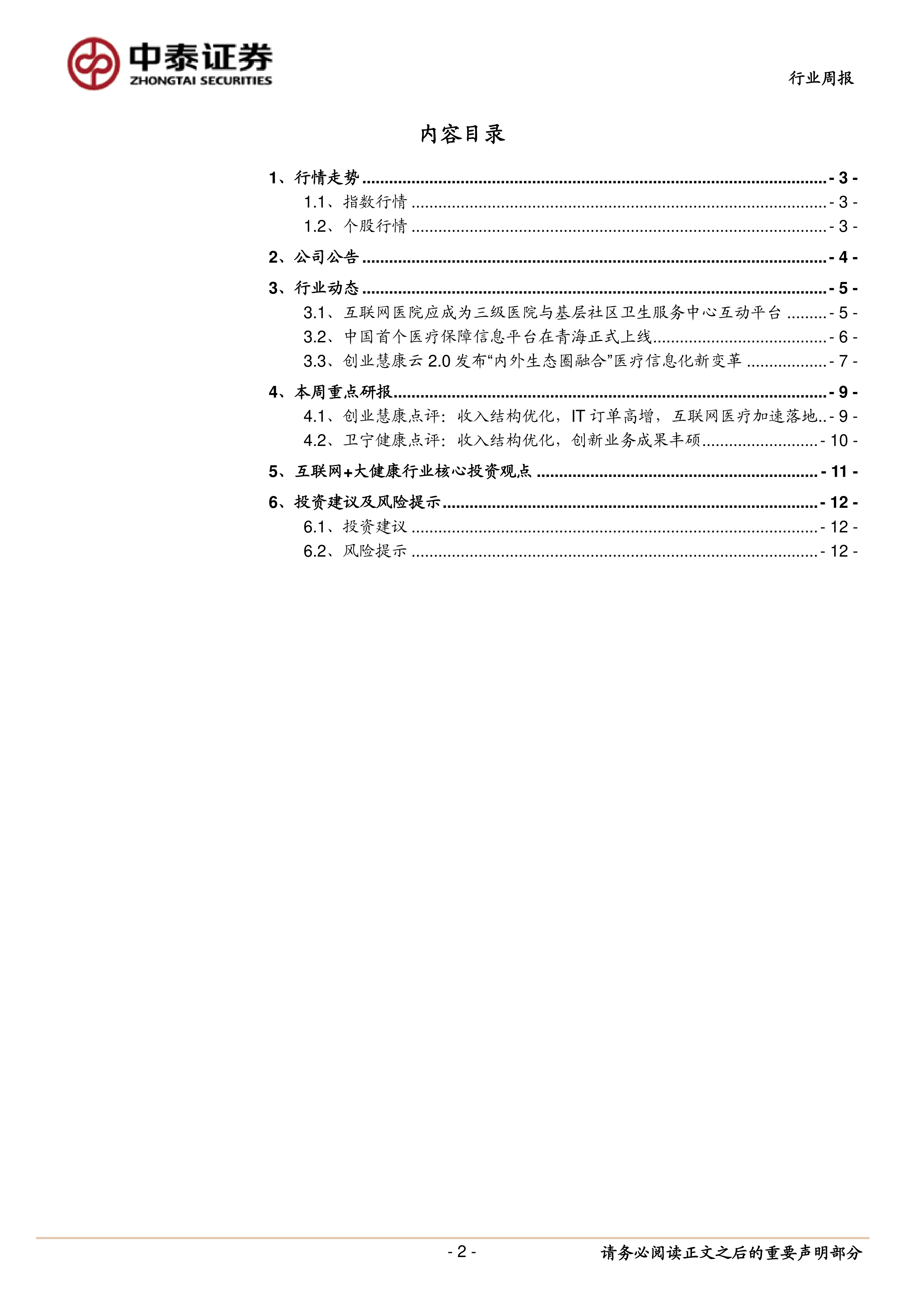 报告最后给出了投资建议,重点关注细分板块及个股,并推荐关注部分优质医疗IT企业和互联网医疗企业。同时,报告也指出了行业发展不及预期和政策落地缓慢等风险提示。