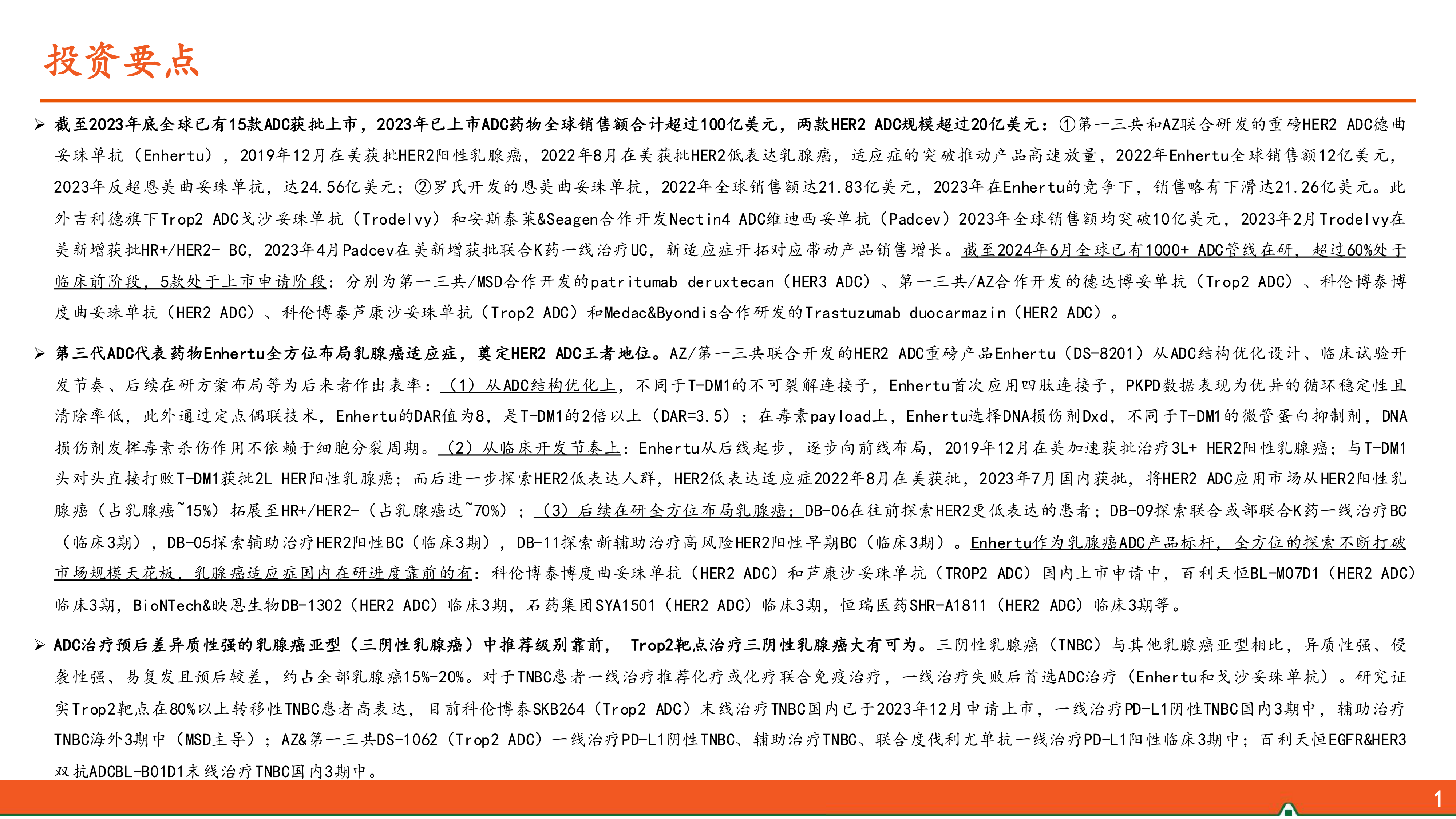 投资建议:自2010年全球首款ADC上市以来,ADC药物研发围绕抗体、连接子、毒素不断优化改进,作为兼具“高效与靶向化疗”的魔法子弹,一方面单药治疗突破后线治疗或靶标低表达困境,另一方面与免疫疗法IO联用潜力挑战前线已上市药物的地位。ADC药物创新在研呈现“后来者居上”、“突破0-1后,强者有望恒强”的态势,前者主要源于后来者始终可就抗体、连接子、毒素三部分优化改进,进一步提高疗效和/或降低毒性,后者主要源于产品实现0-1是对公司ADC研发平台、ADC多环节生产工艺等的正反馈验证,在此基础上有望不断产出。因而针对该领域,我们建议关注管线靠前和/或产品、平台获海外Pharma认可的企业:科伦博泰(核心产品Trop2ADC海外已开展9项全球3期,2024年ASCO大会上公告TNBC和NSCLC数据,结果优异;SKB264末线治疗TNBC已于2023年12月国内申请上市)、百利天恒(BL-B01D1双抗ADC国内已启动6项临床3期,海外治疗NSCLC临床1期入组中,海外由合作伙伴BMS主导;BL-M07D1HER2ADC与恩美曲妥珠单抗头对头国内3期中)、恒瑞医药(截至2024年6月,公司已有19款ADC在研,国内在研布局数量位居第二,仅次于杭州多禧生物,公司已有3款(分别为Claudin18.2ADC;Trop2ADC;HER2ADC)临床3期中,3款(分别为CD79b ADC;HER3ADC;Nectin4ADC)临床1/2期)等。