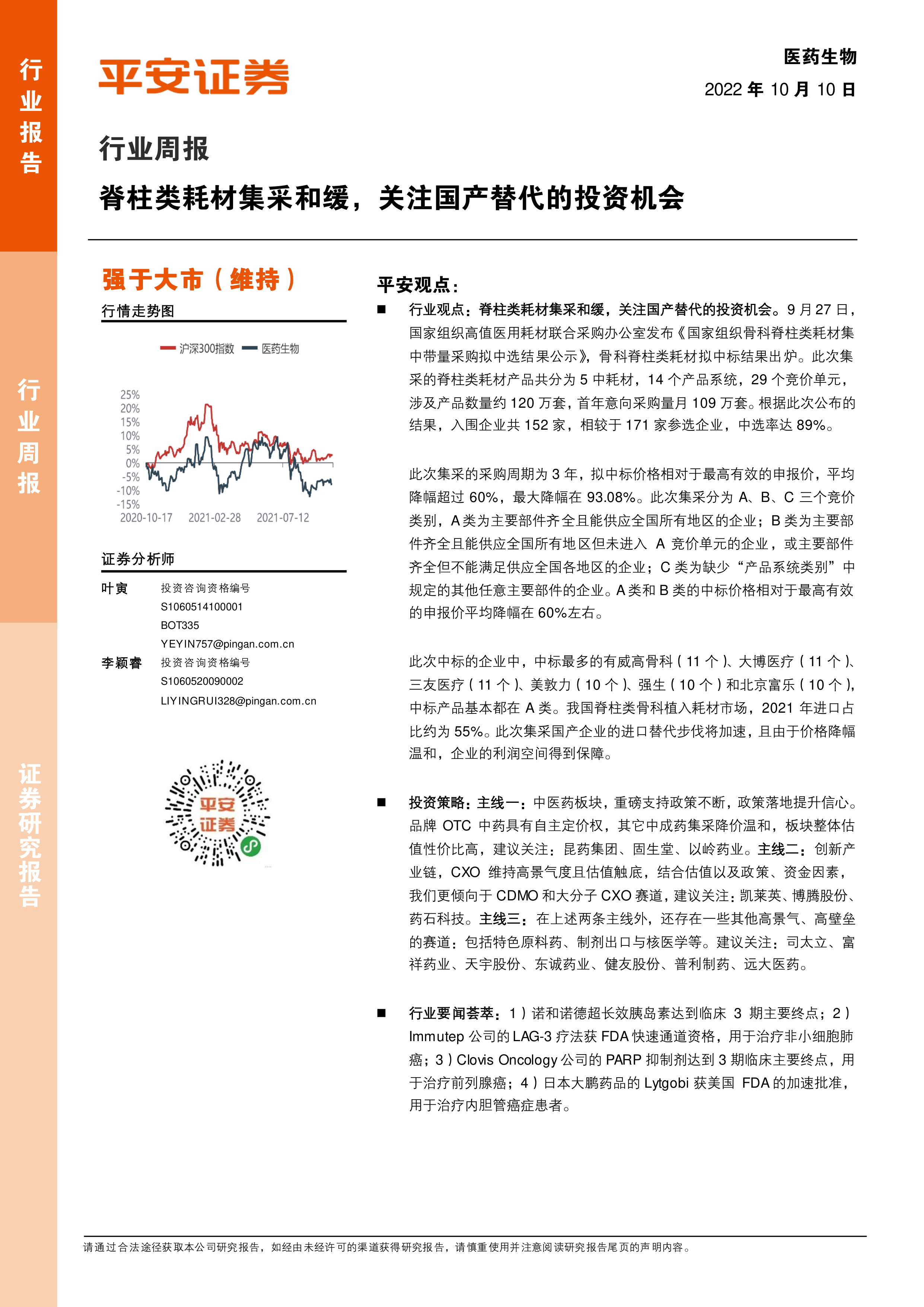 本报告对2022年9月脊柱类耗材集采结果进行了深入分析,认为此次集采对国产企业利好,将加速进口替代。同时,报告提出了多元化的投资策略,建议关注中医药板块、创新产业链CXO以及其他高景气赛道,并推荐了多个具有投资价值的标的。 报告还对A股和H股医药板块的行情进行了回顾,提供了市场动态信息。 需要注意的是,证券市场存在风险,投资需谨慎。 投资者应根据自身风险承受能力和投资目标,进行独立判断和决策。
