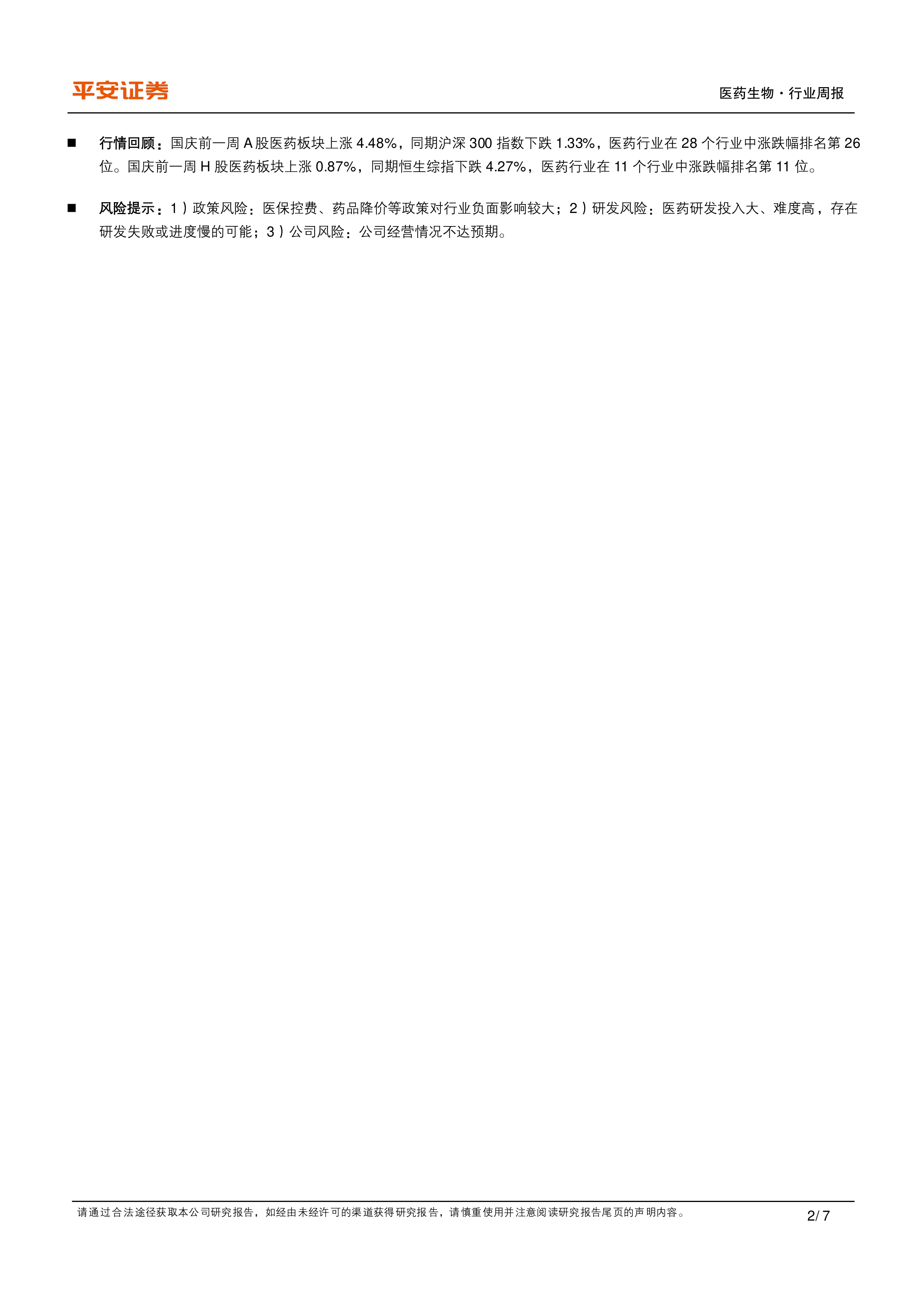 行情回顾:国庆前一周A股医药板块上涨4.48%,同期沪深300指数下跌1.33%,医药行业在28个行业中涨跌幅排名第26位。国庆前一周H股医药板块上涨0.87%,同期恒生综指下跌4.27%,医药行业在11个行业中涨跌幅排名第11位。
