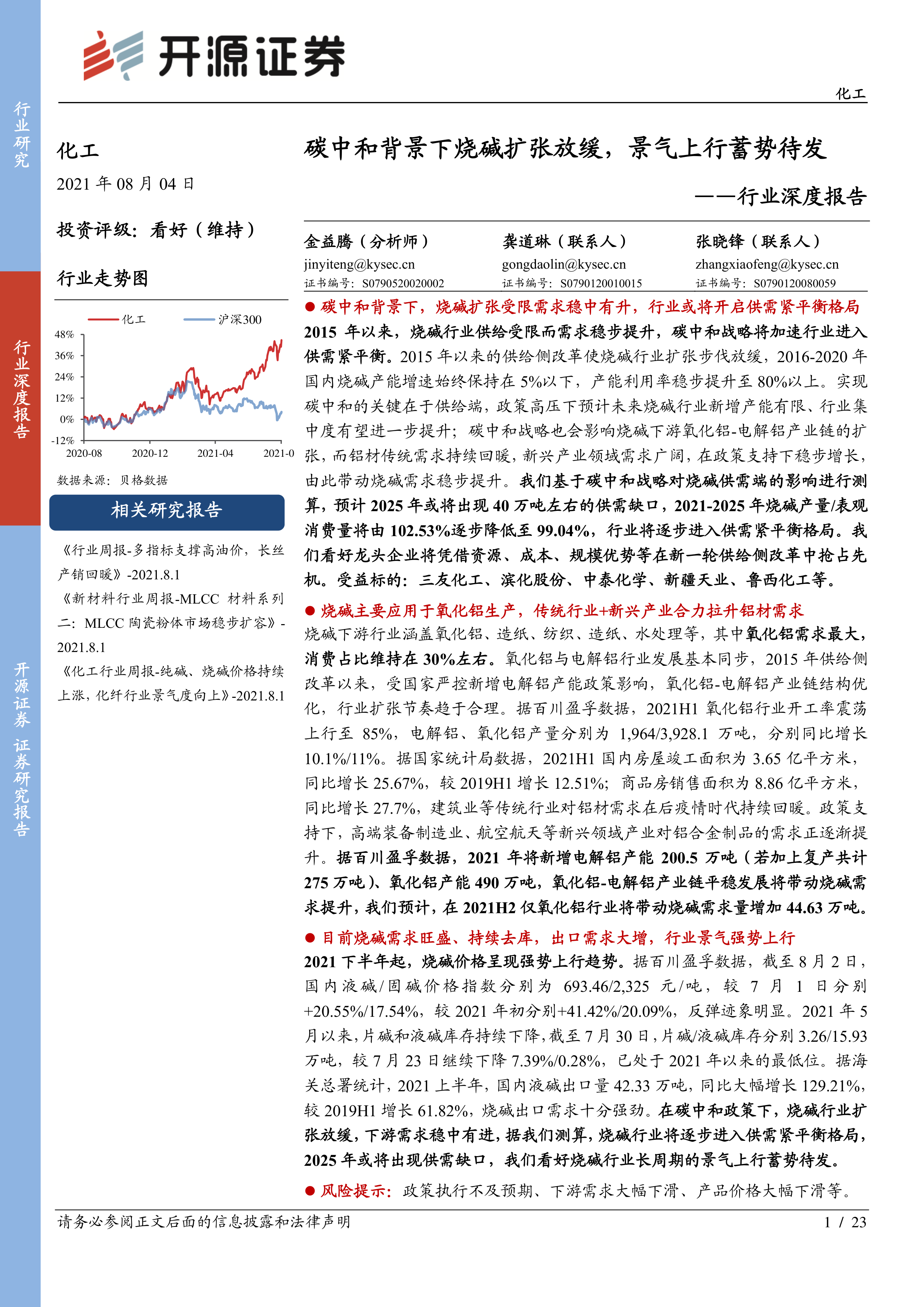 报告最后分析了行业龙头企业的竞争优势,认为龙头企业将在碳中和催生的供给侧改革中抢占先机,并给出了投资建议,看好三友化工、滨化股份等龙头企业。
