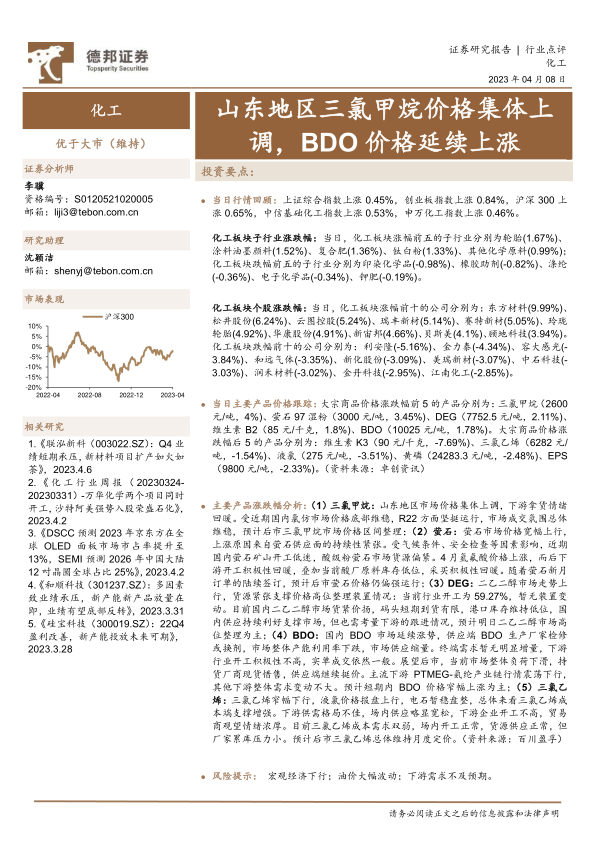 本报告的核心观点是:4月8日山东地区三氯甲烷价格集体上调,BDO价格延续上涨,化工板块整体表现优于大市。部分化工产品价格上涨主要受供给侧因素影响,例如萤石供应紧张、BDO生产厂家检修等。但部分产品价格下跌,例如三氯乙烯,则反映了下游需求疲软的现状。整体而言,化工行业呈现出分化态势,部分细分领域表现强劲,部分领域则面临挑战。