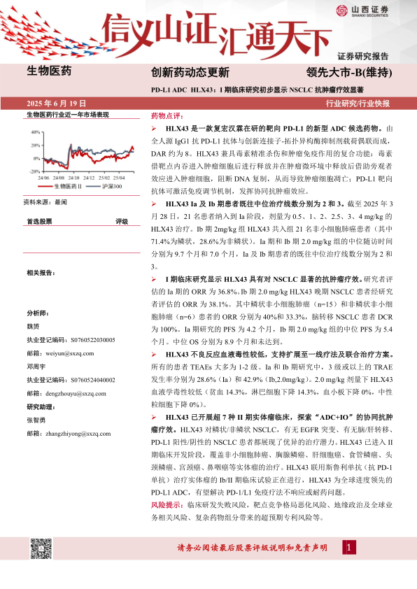 创新药动态更新:PD-L1 ADC HLX43:I期临床研究初步显示NSCLC抗肿瘤疗效显著