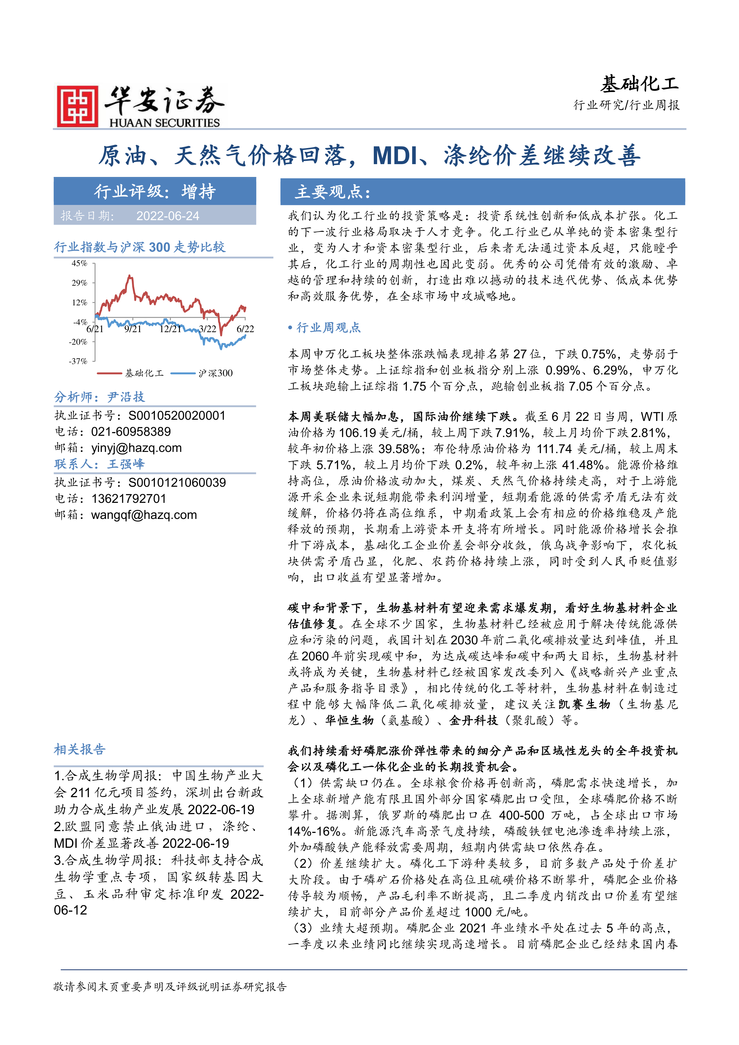 本报告的核心观点是:化工行业正经历从资本密集型向人才和资本密集型的转变,行业周期性减弱,系统性创新和低成本扩张成为投资策略的关键。报告同时分析了原油、天然气价格回落对化工行业的影响,以及MDI、涤纶价差改善带来的机遇,并重点关注磷肥、聚氨酯、煤化工、化纤、农药等细分行业的供需动态及投资机会。 此外,报告还强调了生物基材料在碳中和背景下的发展潜力。