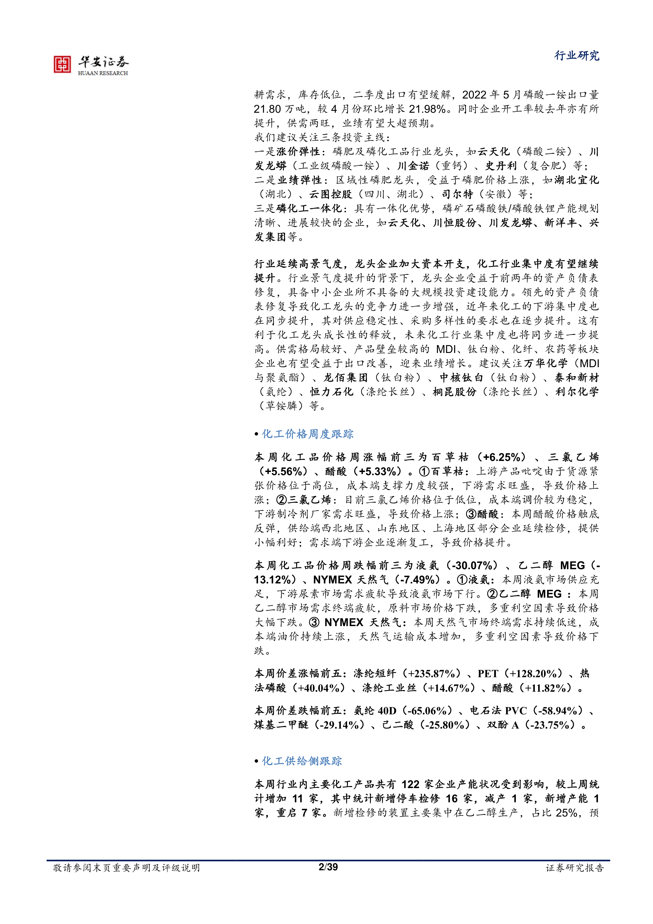 我们持续看好磷肥涨价弹性带来的细分产品和区域性龙头的全年投资机会以及磷化工一体化企业的长期投资机会。