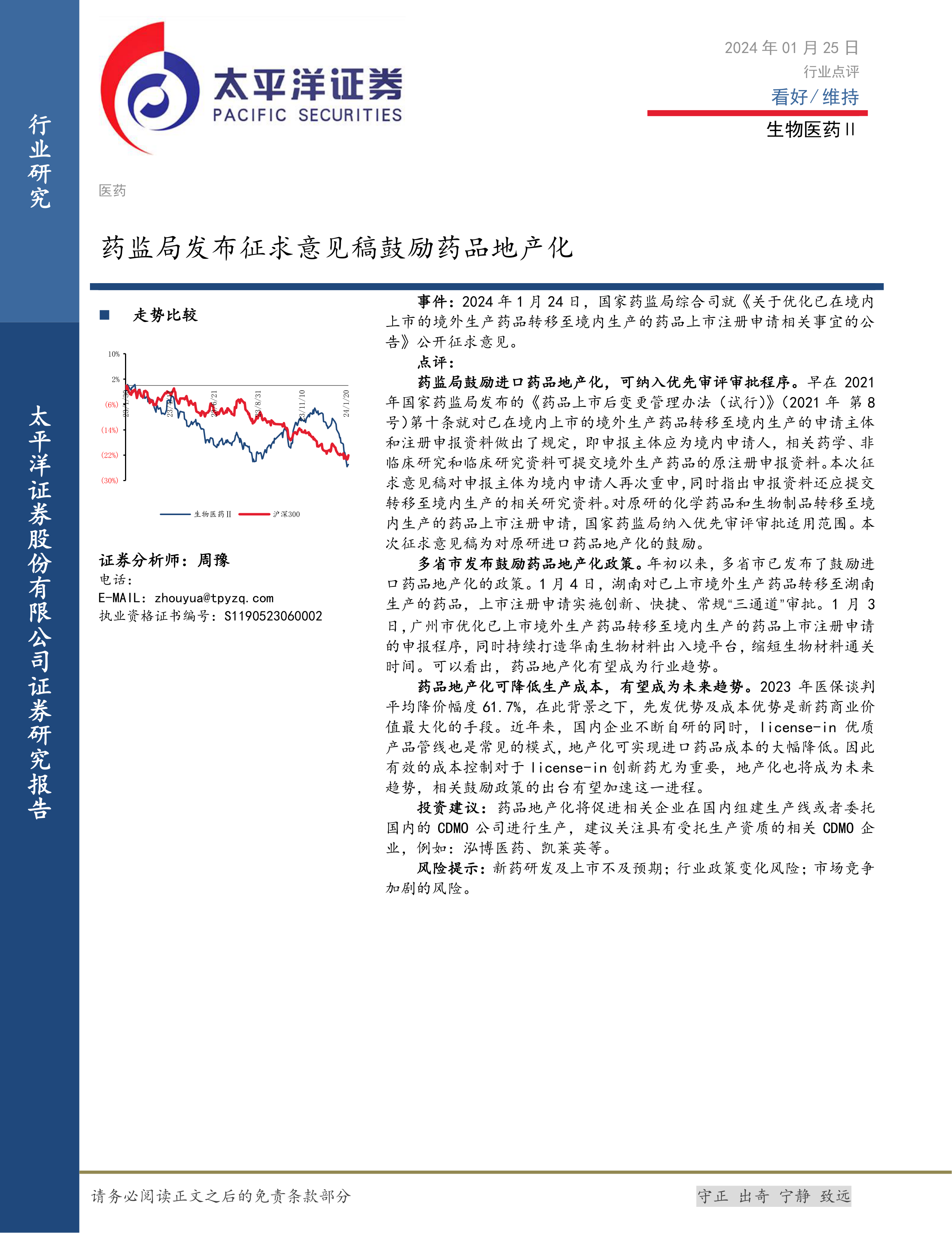 事件:2024年1月24日,国家药监局综合司就《关于优化已在境内上市的境外生产药品转移至境内生产的药品上市注册申请相关事宜的公告》公开征求意见。