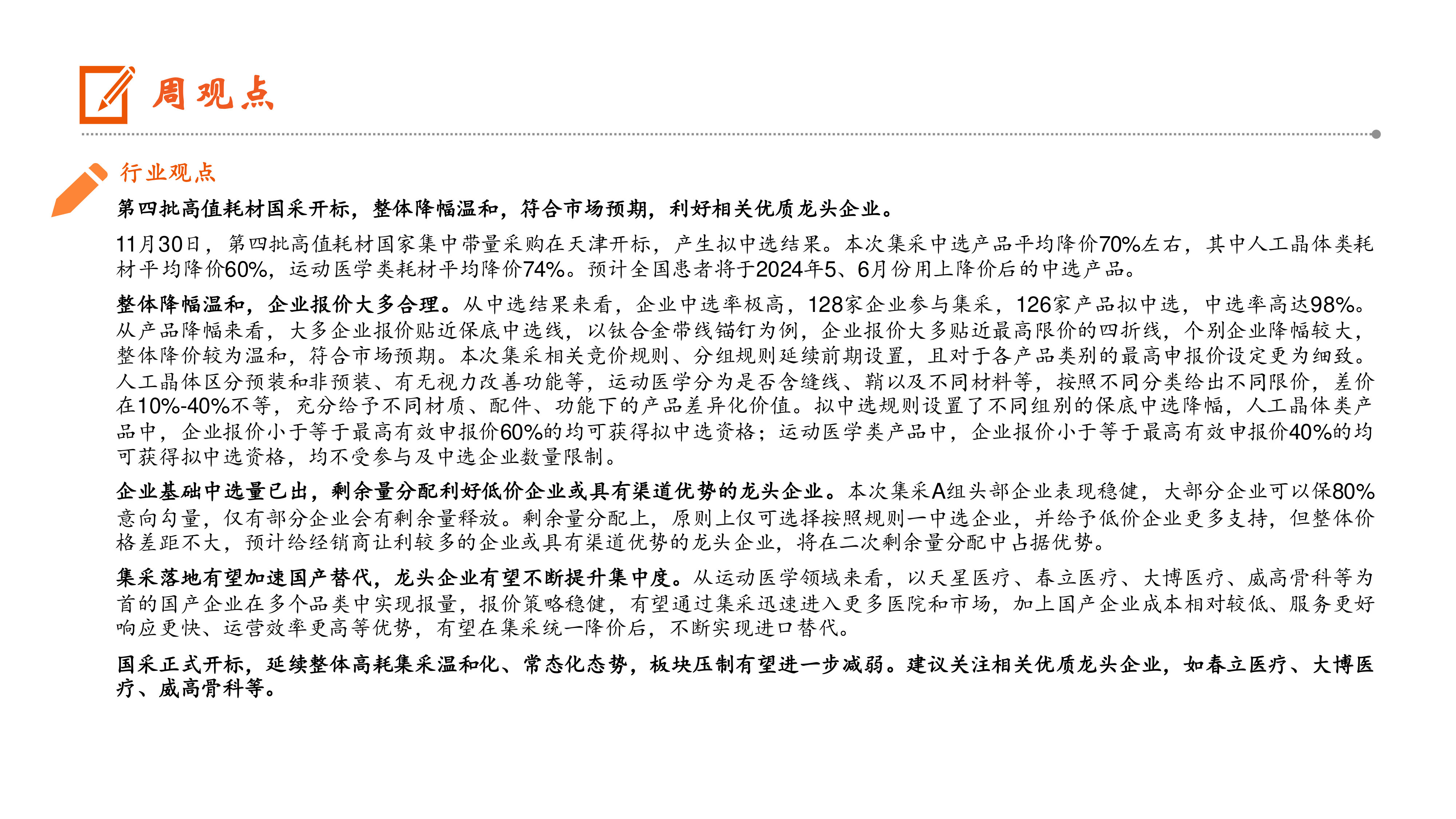 国采正式开标,延续整体高耗集采温和化、常态化态势,板块压制有望进一步减弱。建议关注相关优质龙头企业,如春立医疗、大博医疗、威高骨科等。