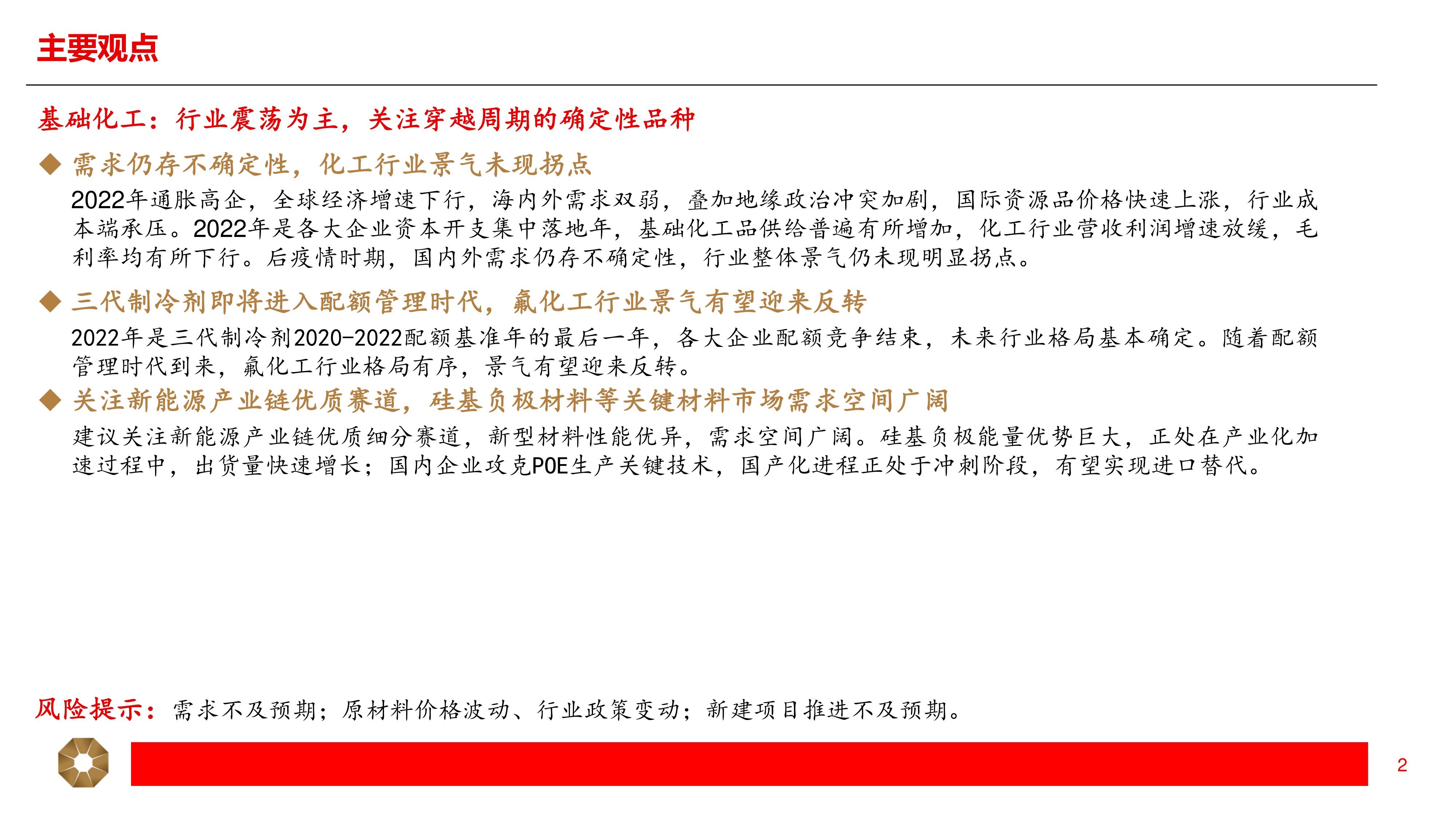 本报告的核心观点是:尽管2022年基础化工行业面临需求不确定性、成本压力上升等挑战,整体景气度未见拐点,但部分细分领域展现出确定性增长机会。报告建议关注以下两条投资主线:一是受益于三代制冷剂配额管理时代来临的氟化工行业反转机会;二是新能源产业链中的优质赛道,例如硅基负极材料和POE等关键材料的广阔市场空间。报告同时提示了需求不及预期、原材料价格波动、行业政策变动以及新建项目推进不及预期等风险。