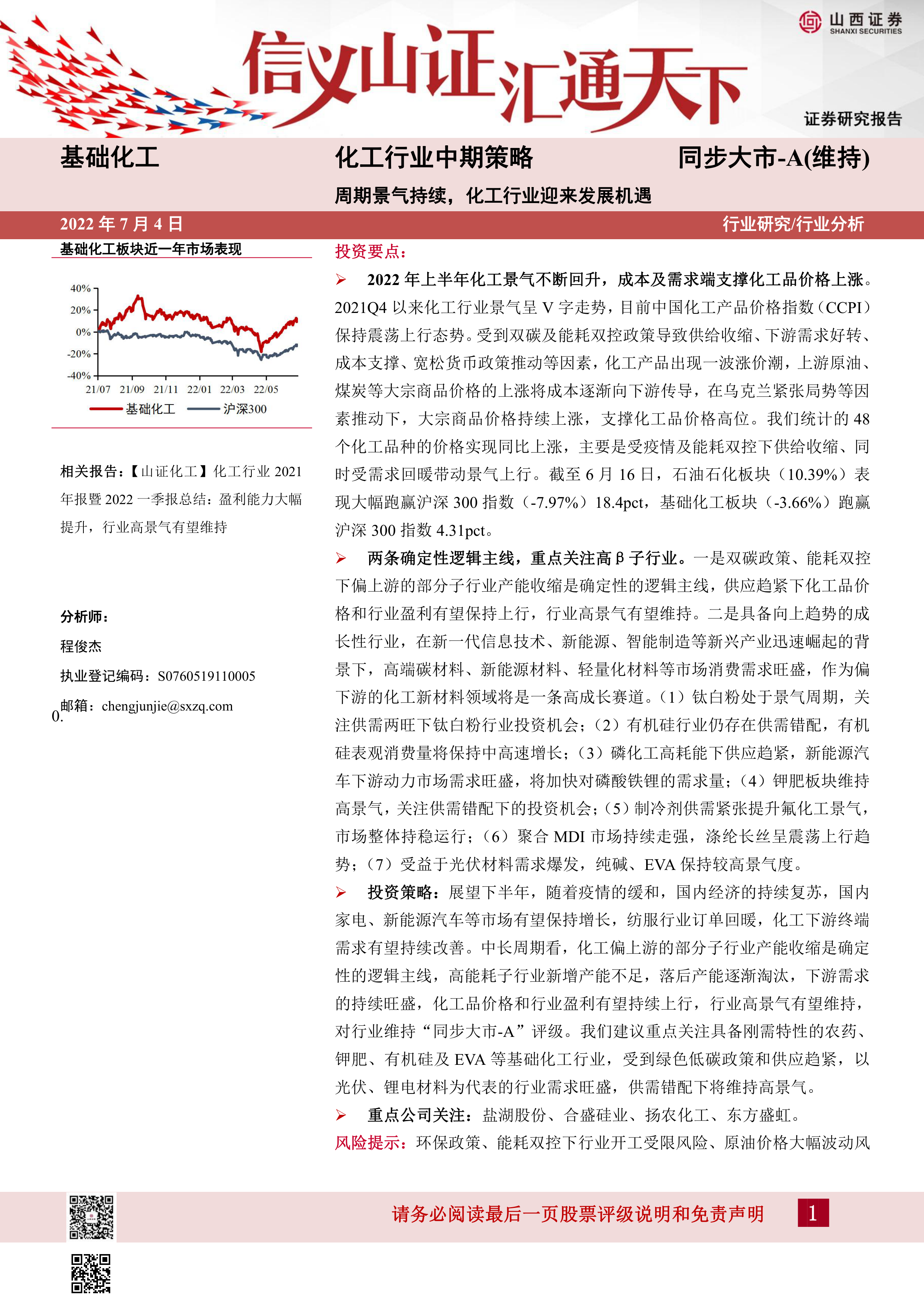 报告最后提出了投资策略,建议重点关注具备刚需特性且受政策利好或供需错配影响的子行业,并推荐了盐湖股份、合盛硅业、扬农化工、东方盛虹四家重点公司,并对每家公司进行了简要的投资分析,包括公司主营业务、竞争优势、盈利预测以及投资评级等。 报告还列出了潜在的投资风险,例如环保政策风险、原油价格波动风险、下游需求不及预期风险等。
