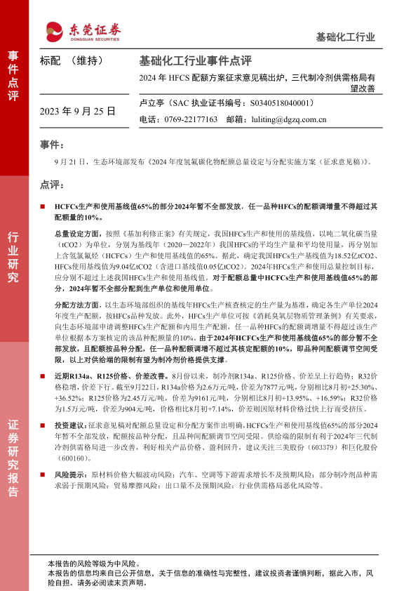 生态环境部发布的2024年HFCs配额方案,通过严格控制配额总量和分配方式,将有效限制HFCs的供应。 这将有利于改善三代制冷剂的供需格局,提升相关产品价格和企业盈利能力。 投资者需关注相关政策的落地情况以及市场价格的波动,并谨慎评估投资风险。 报告建议关注三美股份和巨化股份,但同时也提示了多种潜在的风险因素,投资者需谨慎决策。 本报告基于公开信息,其准确性和完整性无法完全保证,投资者应独立判断并承担投资风险。