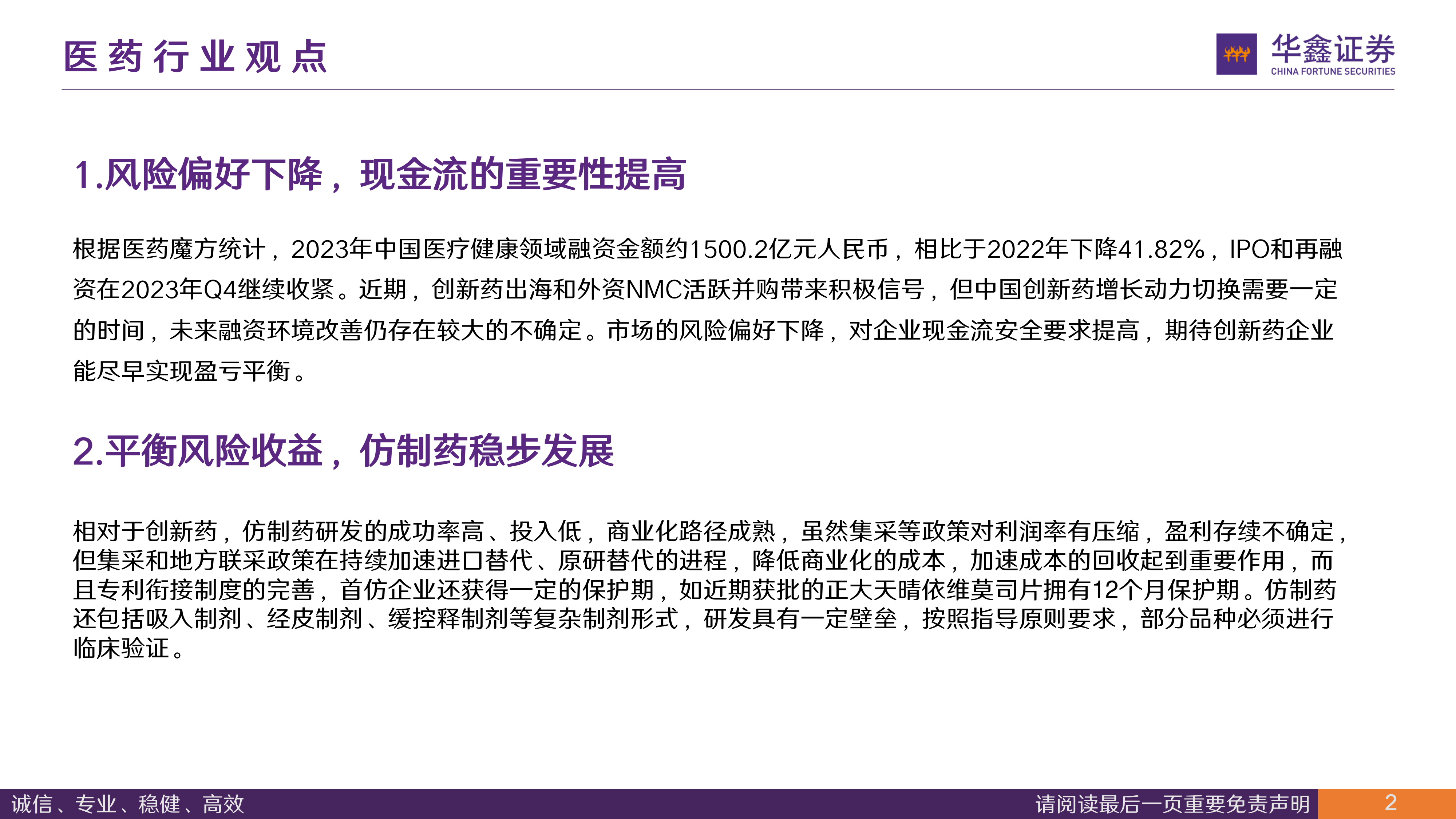 本报告的核心观点是:在风险偏好下降、现金流重要性提升的大环境下,医药行业呈现出风险收益平衡的态势。创新药融资环境面临挑战,但仿制药、中成药以及部分细分领域(如呼吸道疾病检测)展现出较强的增长潜力。报告建议关注现金流稳定、盈利能力较强的企业,并推荐了多个细分领域的投资标的。