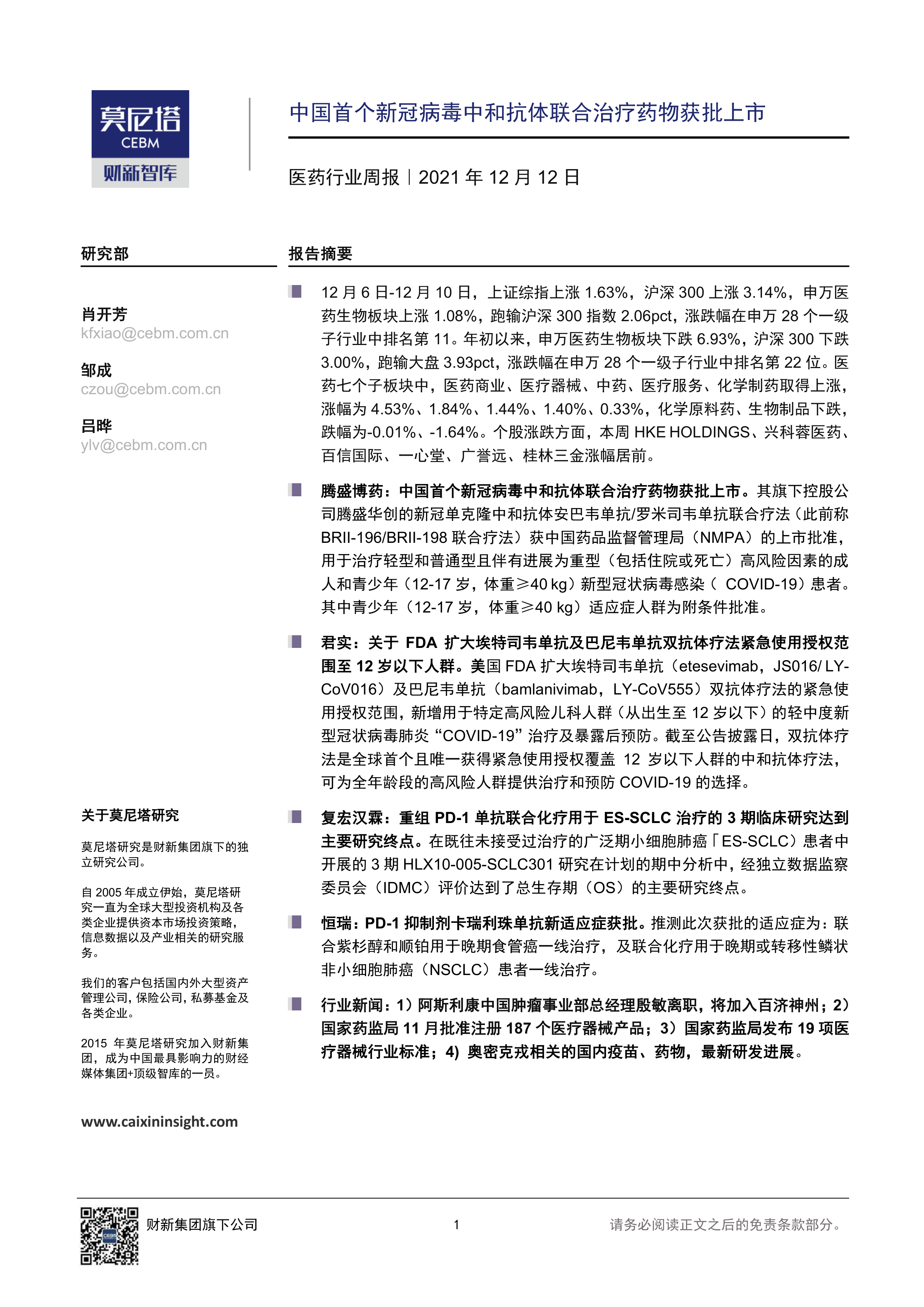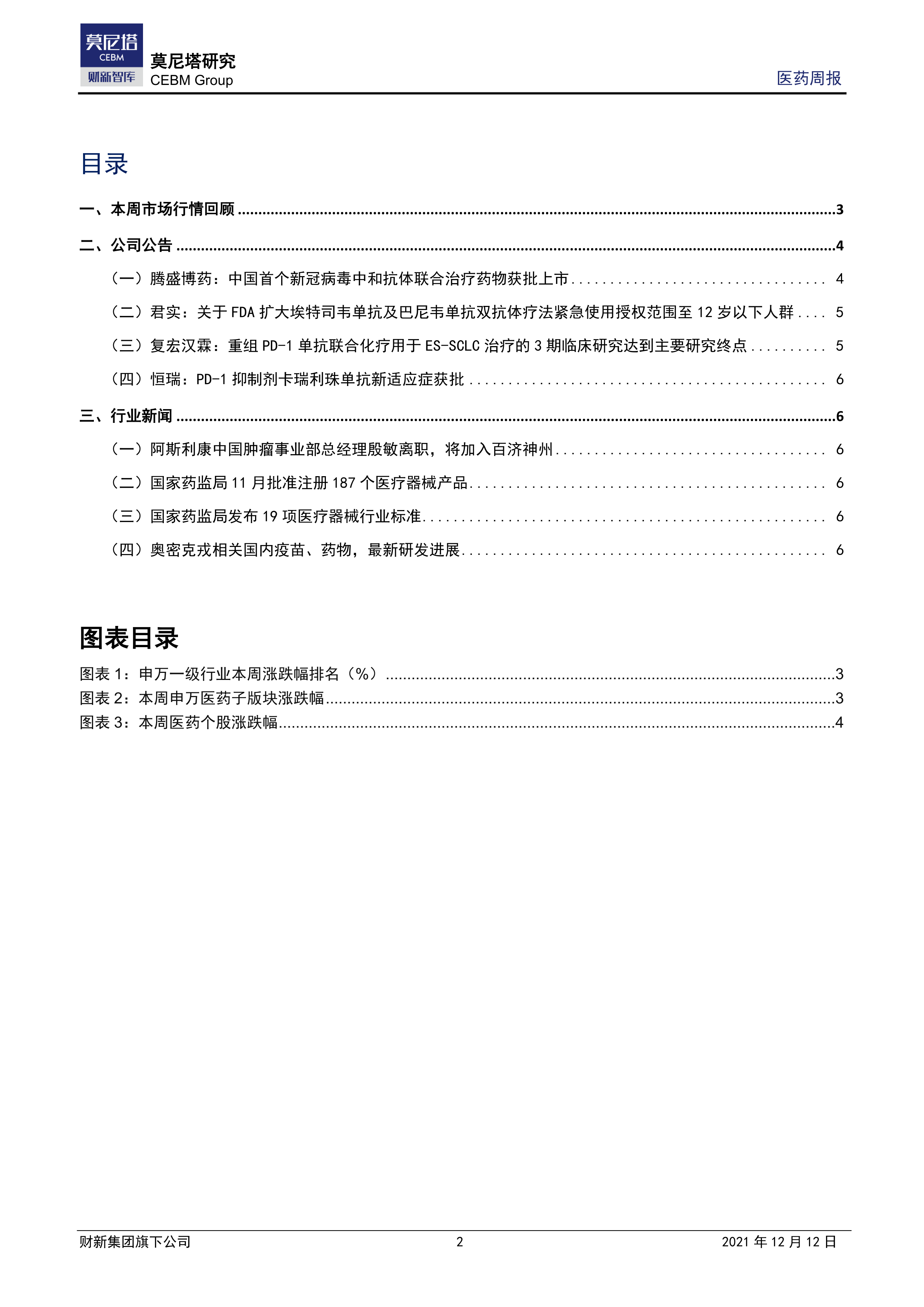 本报告的核心观点是:2021年12月6日至10日,中国医药生物板块整体表现略逊于大盘,但个别公司取得显著进展,尤其是在新冠病毒治疗药物研发方面。腾盛博药的新冠病毒中和抗体联合疗法获批上市,是国内首例,具有里程碑意义;君实生物的双抗体疗法获批用于12岁以下儿童,体现了其在儿科领域的突破;复宏汉霖的PD-1单抗联合化疗在ES-SCLC治疗中达到主要研究终点,展现了其在肿瘤治疗领域的竞争力;恒瑞医药的PD-1抑制剂卡瑞利珠单抗获批新适应症,进一步拓展了其市场份额。此外,报告还关注了行业人事变动和政策动态,为投资者提供全面的市场分析。