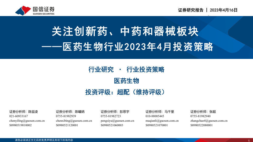 医药生物行业2023年4月投资策略:关注创新药、中药和器械板块