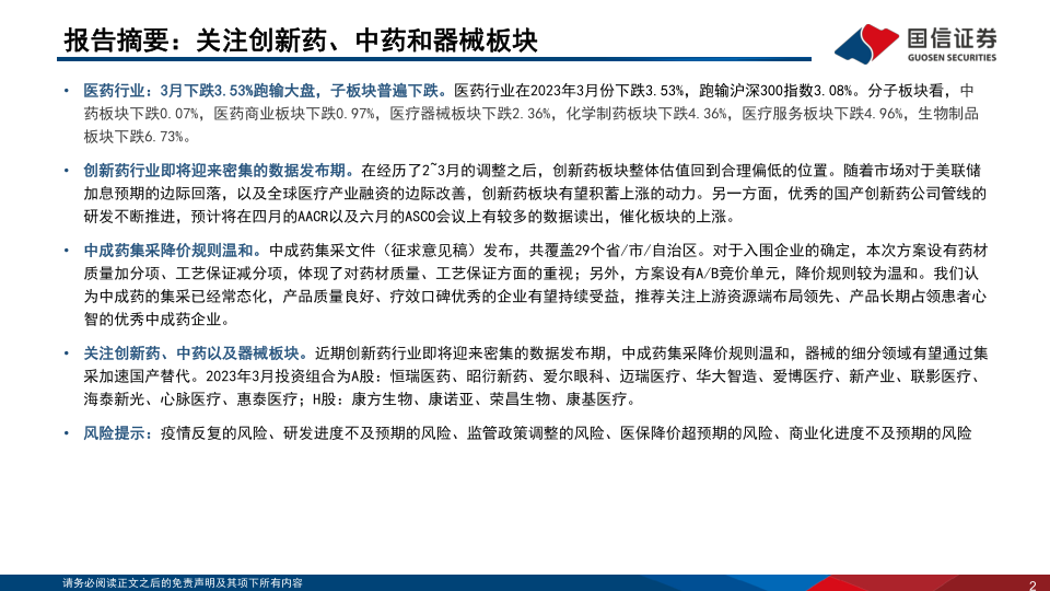 报告认为创新药、中药和器械板块是值得关注的投资方向。